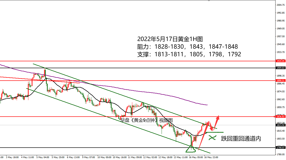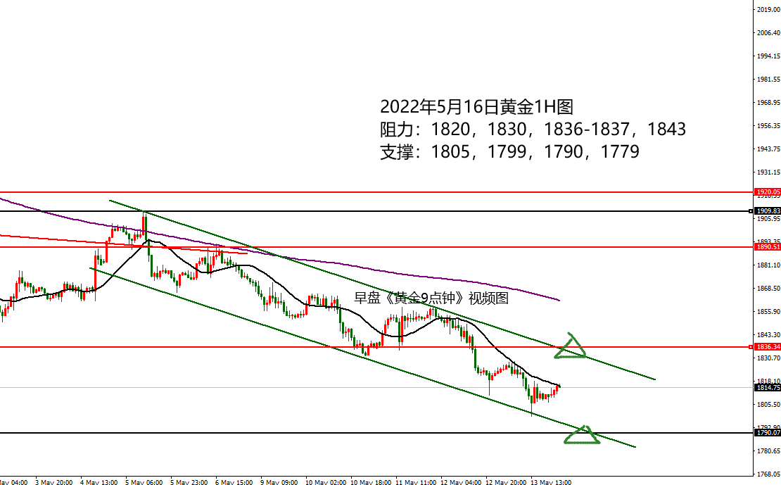 何小冰:黄金1790-1788低多收盈,关注高低点得失 05.16 黄金自1910开始形成这一波扫荡式下跌,过程伴随着空间修正,反弹确定阻力后承压下跌,破低过后又再度反弹确定上方的阻力,然后继续下跌。 而上周的黄金走势更是将整个节奏表现得淋漓尽致,周一承压破低,周二再度承压破低,周三反弹修正,守住高点,周四再度承压破低,周五继续承压破低, 在下跌的过程中,高点下移,低点刷新,逐次向下寻找到更低的位置。 今日早盘黄金同样是承压破低的动作,早盘延续上周五尾盘的空间修正,反弹测试1818压力位置,然后午后承压再破低点。 早盘《黄金9点钟》给了图表显示价格形成下降通道线的区间 ,早盘的位置刚好是在通