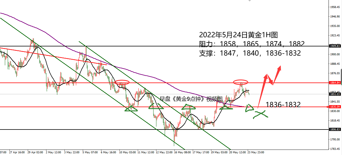 何小冰:黄金午后1850多单收盈,守低仍是关键 05.24 黄金昨日周一开局走高破高,早盘回踩1848位置向上继续再破高点,欧盘回踩1852后继续向上破高加速上涨到1865位置,持续高位横盘调整修正,美盘时段高位回落,回撤幅度稍微比较大,午夜过后加速下探至1847后才止跌反弹重新回到1850上方区域。 前一个回踩的支撑点1848区域还算守住,价格保持此处上方的位置进行调整修正。 在昨日的文章和今日的早盘《黄金9点钟》的分析中罗列了这一轮上涨行情的三波行情, 扫荡式上涨的过程中,仍是要保持守低的动作,一个临近低点1848位置,另一个则是回踩确定的上涨支撑点1832。 那么守住1848,则整体节