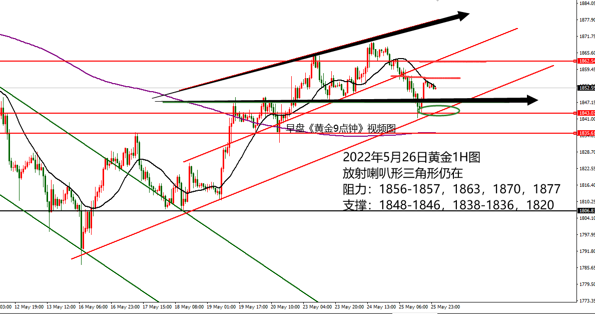 何小冰:黄金守低至关重要,破1857重回上涨 05.26 黄金周一开局走高破高,回踩确定支撑1848区域后继续延续走高破高上探至1865区域,美盘时段冲高回落,承压回踩寻找下方的支撑点。 周二价格再度回踩1848上方区域形成支撑反弹走高,这一次破了高点后进一步走高上探至1869.5区域,尾盘高位横盘跳转。 昨日周三价格承压1868形成承压下跌,持续走低回落,以不破前一个反弹确定的阻力点作为压制,再度走低破低,尾盘加速下探至1841区域,触及形成探底回升再度寻找1857的阻力点,然后横盘修正。 至此,价格围绕本周形成的放射喇叭形的三角形形态进行宽幅扫荡 ,隔夜虽然破了低点,但最终还是回到三角形