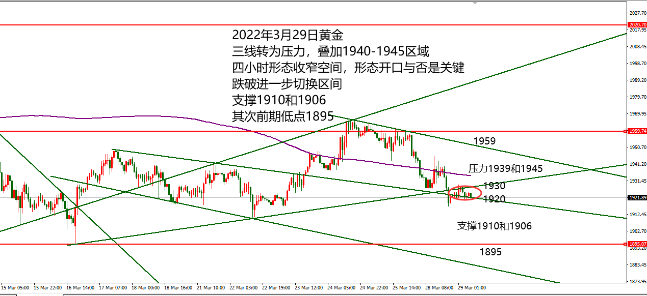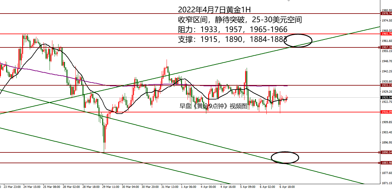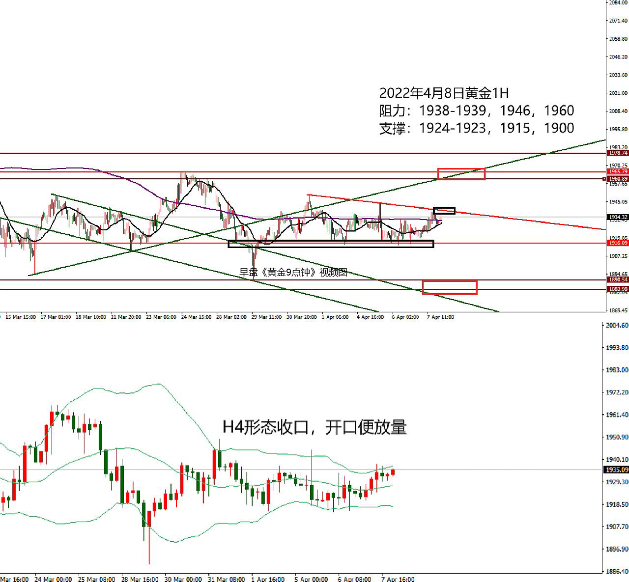 何小冰:黄金是久攻不破终须回落?还是蓄势大涨?04.08 黄金究竟什么时候才是真的的突破选择? 本周围绕这个问题反复再反复的验证,结果到今日周五,还是没有答案。 原因是不延续是黄金最大的特色 ,涨跌均不延续, 在低位持续徘徊,看着摇摇欲坠,结果平地起跳上涨,在高位持续徘徊,看着势如破竹,结果高台跳水跌下来。 来来去去的多空信号反复给,就是没有给最终答案。 现在最关键的就是 四小时形态能不能开口,开口便将放量指引方向。 区间范围1939-1917, 没有看错,下方两个收窄的支撑还是重合在一起,也是多次测试的位置,此处本周也提及多次,多次测试多次弹开的位置,支撑性比较强,强支撑在突破后将实现支撑