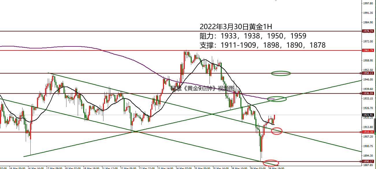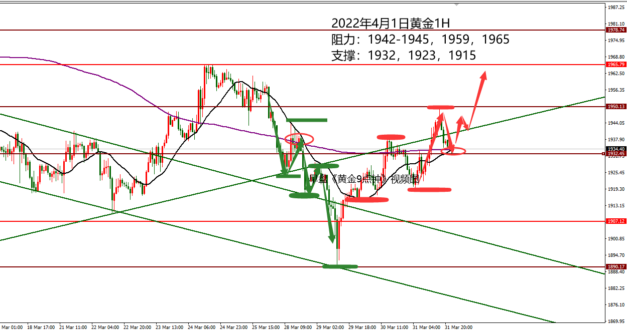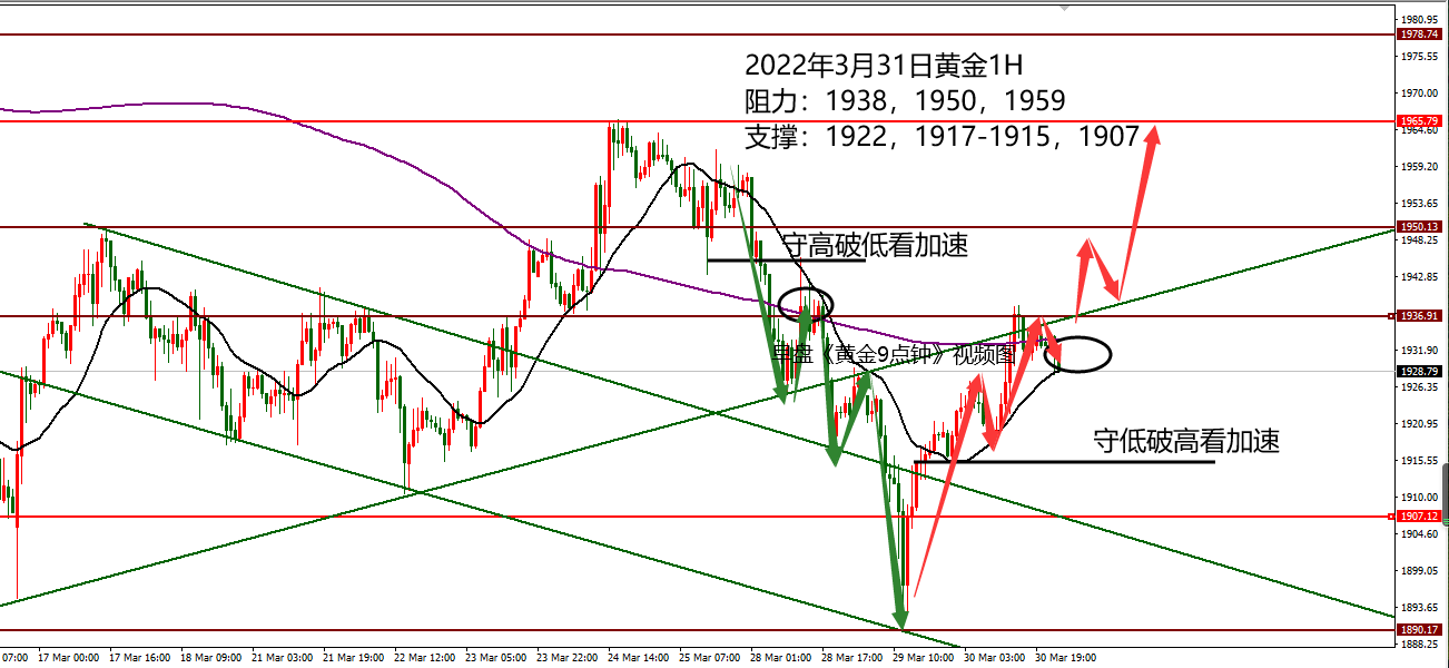 何小冰:黄金守低破高是关键,扫荡明显 03.31 黄金周一白盘承压 1959回落下跌,接连失守1950,1940和1930,最终在欧盘下探至1925获得支撑探底回升反弹,美盘围绕1930-1945的区间扫荡来回,尾盘承压1940,跌回1930的下方,进一步放了下跌至1917区域。 周二白盘承压 1930回落下跌,接连失守1920和1910关口,美盘前承压1916短线急跌26美元,跌至1890,美盘反复测试低点的支撑,探底回升,接连收复1910关口和1920关口。 周三白盘支撑 1915反弹走高,欧盘回踩1917再度确定支撑走高攀升,美盘突破1930,再度回踩1922后继续攀升冲刺1938区域