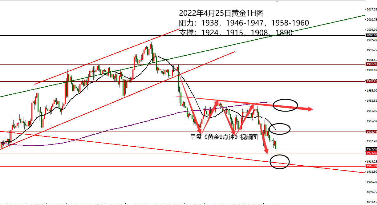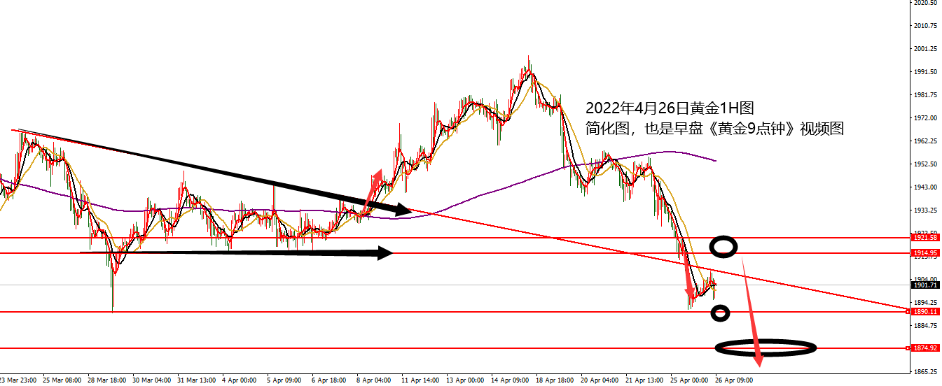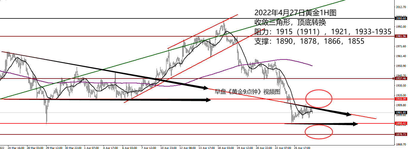 何小冰:黄金短多修正,确定阻力再空 04.26 黄金从上周五跌回1950关口进入这一波下跌的行情,当然上周五还保留有扫荡的特色,跌20美元又涨17美元再跌20美元。 昨日周一开局黄金直接低位走低,接连跌破支撑线,更是跌破前期收敛三角形的魔性支撑1915(此处在前期反复测试,然后最终依托价格向上突破收敛三角形,进而走高刷新新高),美盘时段反弹确定1911的阻力点,再度承压走低跌破1900关口,价格逼近前期的低点1890区域,不过没有到这里,反而低位横盘调整。 昨晚到现在,白银是止跌调整状况,控场王都修正了,黄金也面临着修正的需求。 凌晨到欧盘时段都持续处于修正的状况,若是时间修正 ,这样子的修