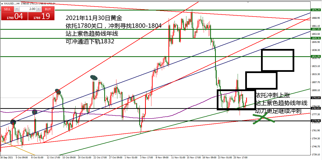 何小冰:黄金1783之上多单盈,守低将继续上涨 11.30 昨日周一,黄金早盘急跌后急涨形成探底回升走势,随后持续横盘1790上方区域,欧盘到美盘时段均是震荡走高攀升至1799-1800区域,除了早盘的急跌急涨20美元,之后所看到的行情基本是10美元左右,直至美盘过后价格承压1800关口回落,跌回1790下方,才进一步扩大跌幅,当然尾盘还是守住1780关口,继续保持震荡的特色。 这一点在昨日文章中也有提及,近期的黄金除了上周周一是延续走势,其他时间的周一均是区间调整修正为主 ,所以对于黄金的思路保持着一点震荡防守思路。 围绕小时图支撑1785和四小时图1780的综合给出1783之上看涨攀升的