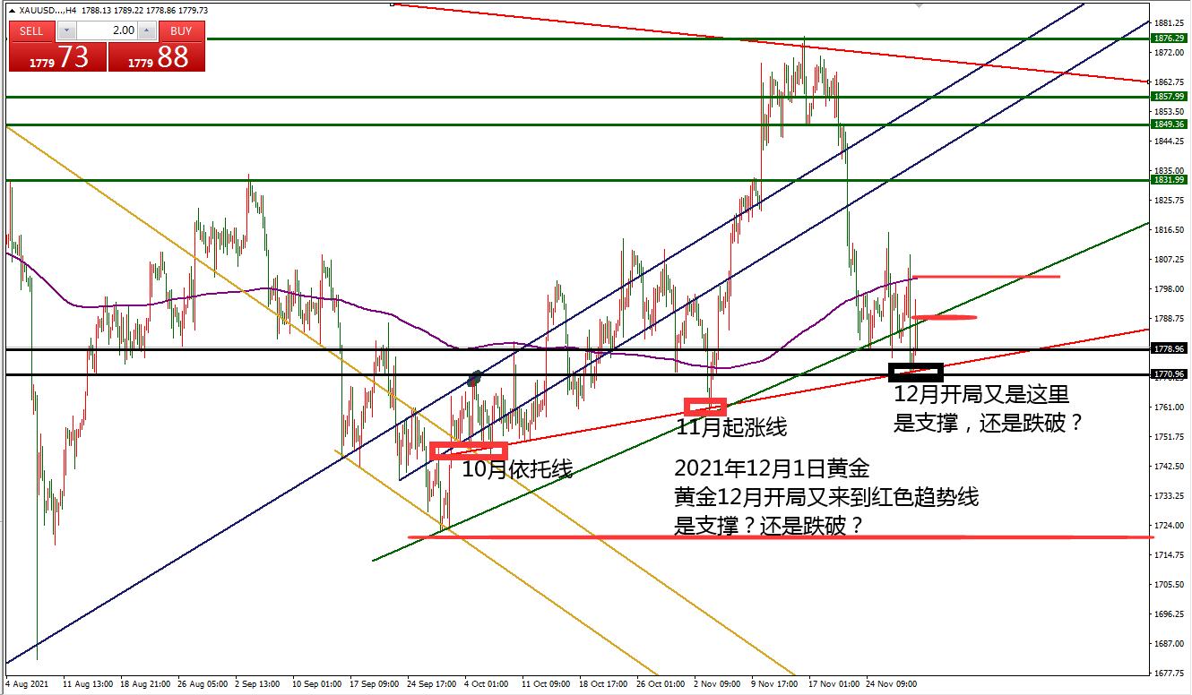 何小冰:黄金12月开局又到红色趋势线,是支撑还是跌破? 黄金昨日11月月末收官之际,再度将价格拉到红色趋势线位置,10月份的月末收官同样是将价格拉到红色趋势线位置1758.8,然后形成探底回升的动作,冲刺拉升,加速再加速到达1877区域,这一次再度来到红色趋势线位置,结果会是如何呢? 上周我们给出的期盼是到达红色趋势线位置参考历史重演看涨攀升,然而到达此处是到昨晚才实现,价格下探过后低位横盘,今日早盘依托走高上周逾二十美元,此处的支撑作用还在。 这一条红色趋势线是10月份的依托线,也是11月份的起涨线,接下来关注的就是能不能成为12月份的依托线了 。一鼓作气,再而衰,三而竭。 上周围绕收窄的