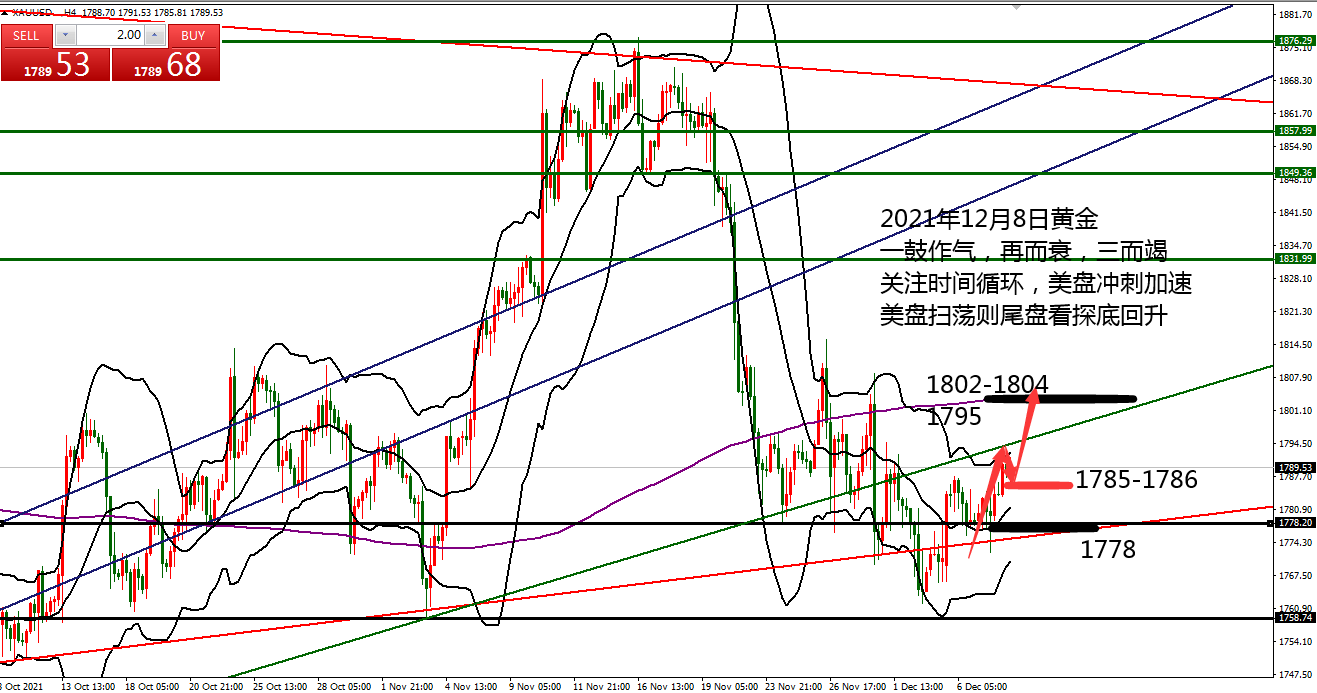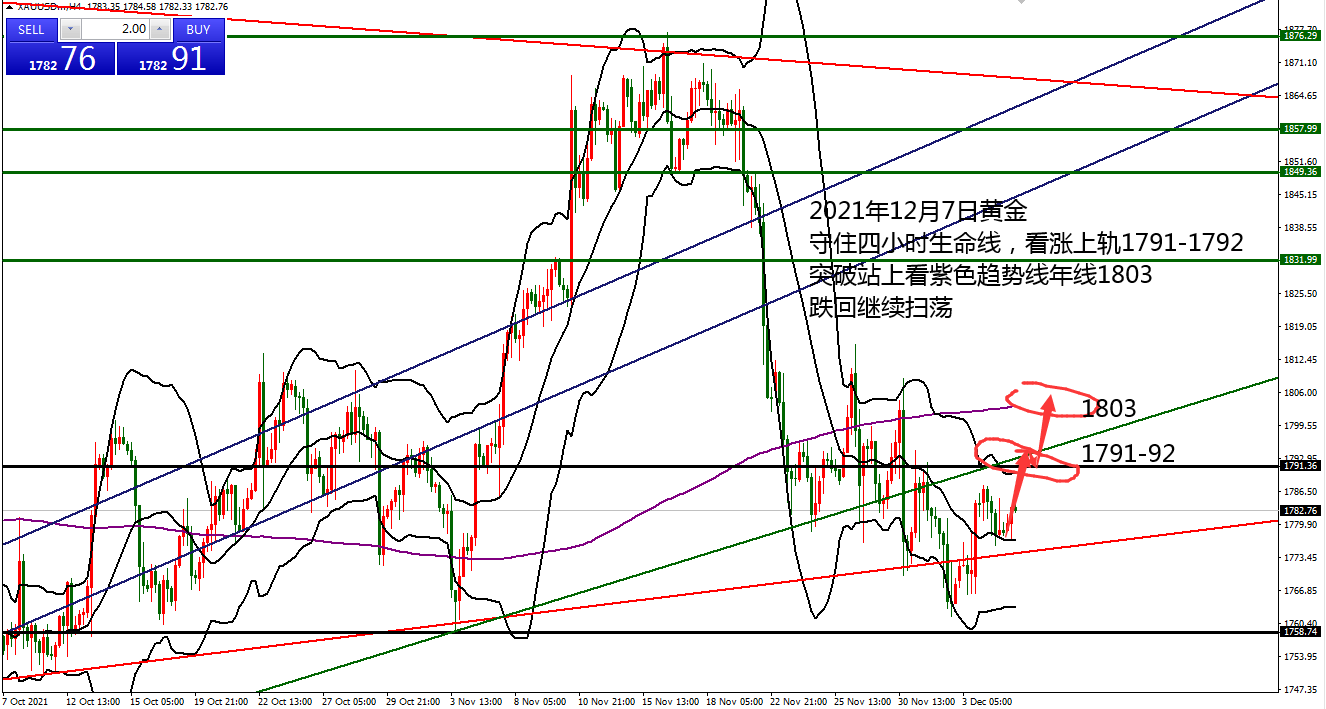 何小冰:黄金守住非农低点,有望历史重演 12.06 上周黄金扫荡式下跌,围绕四小时上下轨的区间来回扫荡, 上下突破之后,价格仍是回到四小时上下轨的区间范围内。 小非农探底回升收阳,非农当天也是探底回升收阳, 相对于小非农尾盘的冲高回落,非农的黄金则是在午夜过后才启动发力,站上1780关口加速攀升冲刺。 今日周一,早盘黄金开盘震荡走高,稍微破了高点,欧盘承压回落,破了早盘的低点,价格现在处于四小时的生命线上方。 以生命线作为分界,接下来价格能够依托生命线, 将有望寻找上轨与支撑阻力线重合的1791-1793区域 ,此处多头掌握更多的主导权。 继续 保持扫荡,则关注红色趋势线(此处多次提及)以及