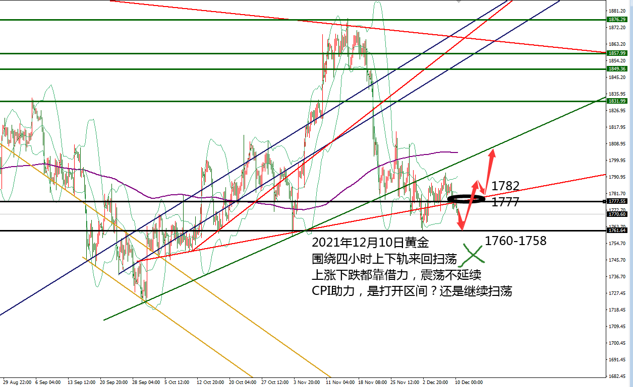 何小冰:通胀CPI登场,黄金1760-1780哪边突破12.10 黄金本周前四个交易日均是偏向于区间震荡调整, 上涨需要一次下探的借力才能实现,下跌需要一次冲刺的借力才能够实现,因此可以不断看到冲高回落或是探底回升的走势。 围绕的空间点便是四小时的上下轨区间 ,前半周依托生命线向上攀升到上轨,后半周承压生命线向下寻找到下轨的位置。 现在的位置就在下轨区域。 时间点上, 白盘偏向于窄幅震荡,美盘将空间扩大后出现不延续的扫荡行情,冲高回落或是探底回升,将扫荡进行到底。 在时间上需要留意美盘冲高易回落,下探易反弹,偏震荡性的行情节奏。 另外一点,现在的价格在四小时的下轨位置,同时也再度跌回红色趋势