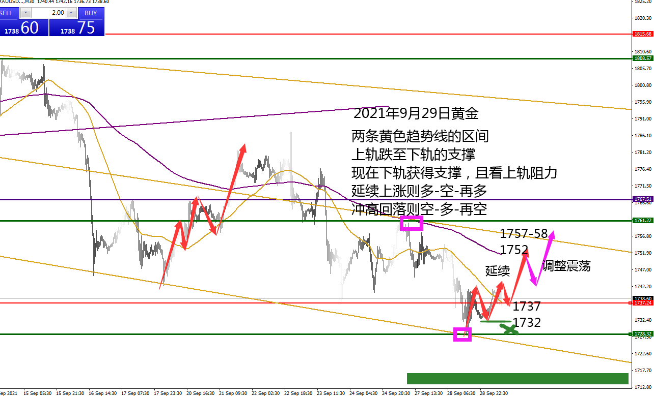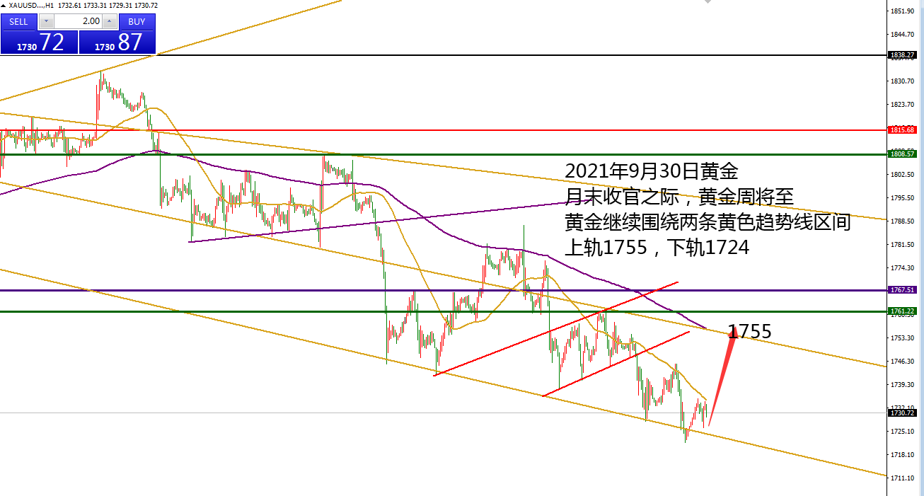 何小冰:趋势空间运行,黄金守低可涨见1755 黄金9月月末收官之际,在整一个9月的行情过程中,以独特的扫荡式向下下跌, 每一次放量下跌之前,伴随着横盘调整修正,然后冲高回落,破低放量,接着继续进行横盘调整,再冲高回落放量下跌。以此节奏,9月份黄金累计下跌将近113美元。 本周由于美联储或加快缩表的信号推升美债收益率攀升走高, 打压黄金形成抛售下跌 ,维持两条黄色趋势线的区间进行运行调整,(如图所示) 上周承压回踩支撑与下轨的趋势线,然后开始攀升向上,本周刚好反弹触及上轨的趋势线位置1761区域形成承压回落,然后反复逐步回踩下探触及下方的黄色趋势线的位置,第一次触及在1728位置反弹到1741