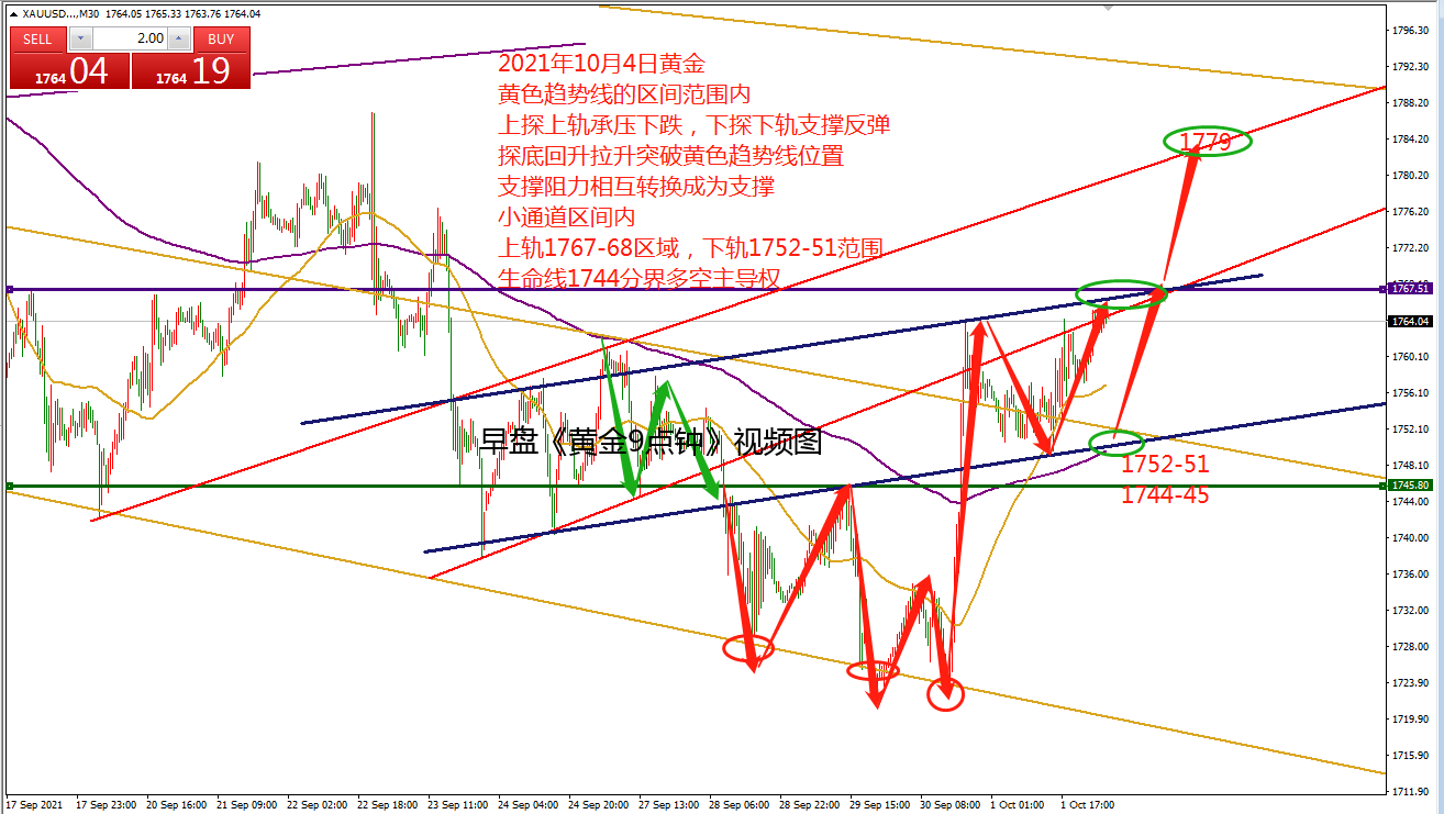 何小冰:10月初黄金小通道运行,突破切换 10.04 本周超级非农数据周,市场需要重点关注大小非农就业数据报告,在上周公布的美国通胀指标8月个人消费支出同比增幅创下30年以来的新高,通胀上行压力,给美联储释放的鹰派态度当头一棒。 美联储再提就业和通胀两个参考指标,接下来就业数据的好坏就至关重要了。 技术面上,8月份的黄金扫荡式的上涨,从跌破最邻近的起涨点开始改变节奏,9月份的黄金扫荡式下跌,现在的反弹是否意味着反转, 需要关注最邻近的起跌点是否被突破,现在可以看到的位置是 1776.5和1787 ,这两个位置至关重要,将是后续行情关注的重点。 上周围绕两条黄色趋势线进行来回运行 ,先是承压上