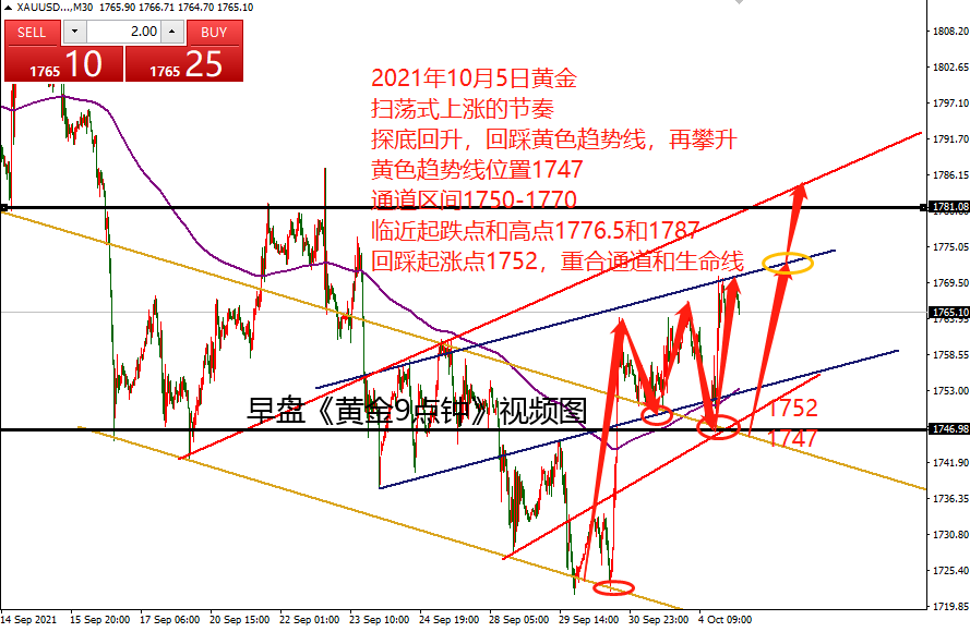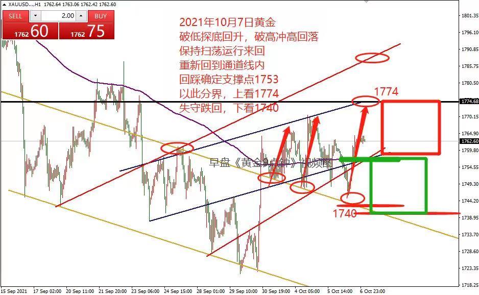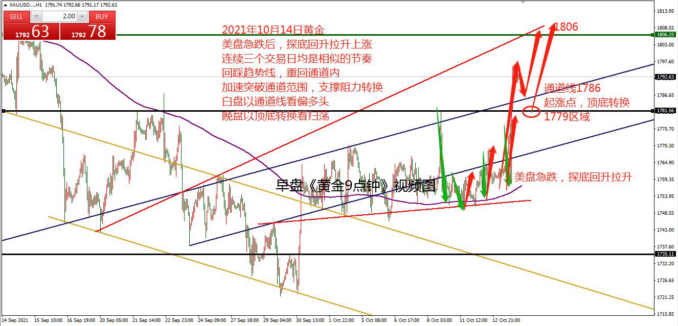 何小冰:时间循环,黄金美盘1810-1780扫荡 10.14 本周黄金三个交易日均有相似的节奏,便是美盘时段急跌,随后探底回升拉升冲刺,破高加速冲刺,尾盘到凌晨期间走调整修正。 周一美盘下探1751-50区域形成探底回升上探日内高点,周二美盘下探1754形成探底回升破高点,冲刺1769区域,周三美盘下探1758形成探底回升破高点强势拉升至1796。 由此可见,在美盘时段的急跌需要重点留意,急跌放量过后,形成探底回升, 则价格还将继续向上攀升冲刺,尾盘是调整修正的。 今日周四,在昨日黄金大涨38美元强势拉升过后,价格站上通道线的上轨区域, 今日早盘《黄金9点钟》提及黄金可以关注第一道支撑通道线