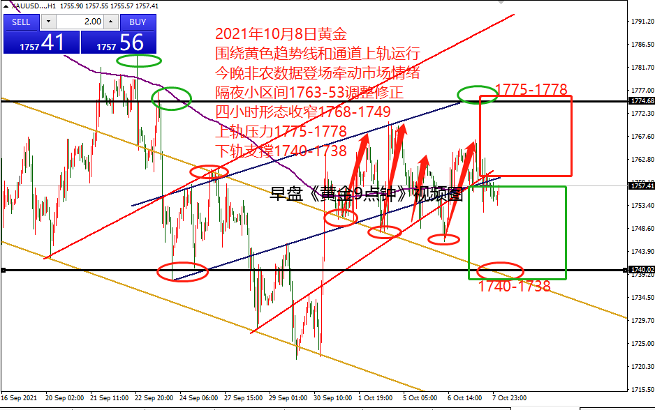 何小冰:非农后首个交易日,黄金能否延续10.11 黄金上周主要通过两点看市场行情: 一是9月下跌规律是否改变, 改变从涨破最邻近的起跌点和高点1776.5和1787区域作为开始,而非农大涨至1781区域后,形成冲高回落收复全部的跌幅,这一点又跟9月的特色规律相似,仍需关注这个特色规律; 二是围绕黄色趋势线和通道线上轨区间进行来回对待 ,上周基本围绕这个区间内进行来回震荡运行,现在价格仍是处于这个区间范围内,随着时间的推移,上方阻力在1778-1780区域,下方支撑在1738-1736范围,这个区间仍将是后续行情关注的重点。 另外需要注意的是四小时形态的收窄,上下轨区间1749-1768, 配