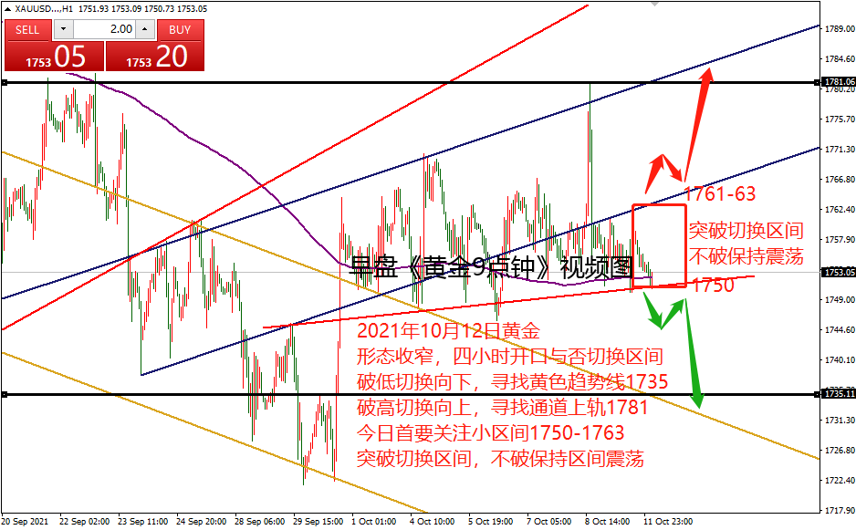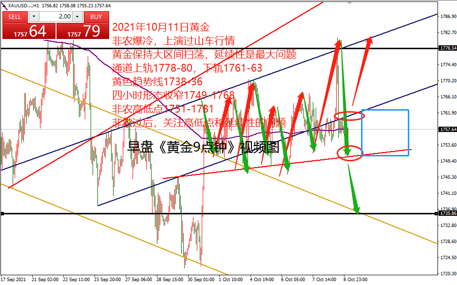 何小冰:黄金守住1755可看1773,失守震荡重选 10.12 上周五非农黄金,先是依托1753震荡回到1760的上方,非农数据公布后依托1761向上攀升20美元到达1781区域,随后开始上演过山车的行情,冲高回落收复全部的涨幅,最低跌至1751位置,承压1760下方结束当天的行情。日线和周线均是收取冲高回落线。 而昨日周一,围绕上周五尾盘的调整区间1761-1751区间进行来回震荡运行, 刚好也是如图通道线下轨与红色支撑线之间的空间。 意味着,后续的行情,能够打开这个区间,行情区间也将进行切换。 配合着四小时形态的收窄对待, 当形态开口之时,又配合区间重新选择,意味着动力也会更足。 而在没