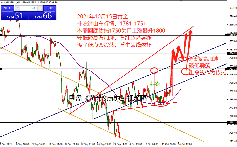 何小冰:黄金1778-1808区间,继续扫荡 10.15 扫荡已然成为黄金的代名词,无论上涨还是下跌都是靠着扫荡 ,8月份扫荡式上涨,9月份扫荡式下跌,而10月份黄金周同样是扫荡,冲高回落,探底回升,然后扫荡式冲刺1800关口。 在上周的分析中, 有重点强调一点,就是8月份的扫荡式上涨,从跌破最邻近的低点和起涨点开始 , 9月份的扫荡式下跌节奏的改变, 需要从涨破最邻近的高点和起跌点1776.5和1787区域开始。 非农冲刺破了第一道位置到达1781,随后急转直下跌至1751区域,虚破冲高,而本周反复测试1750关口的支撑后探底回升拉升攀升,突破非农的高点1781,进一步破通道线位置,加速攀