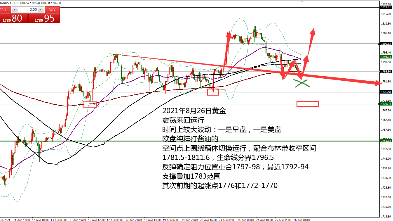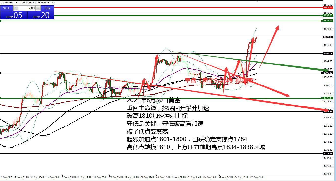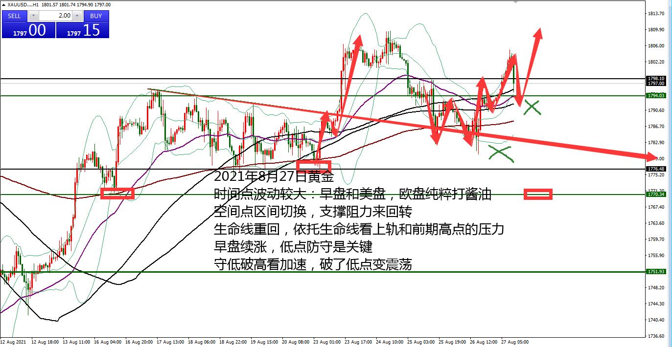 何小冰:黄金如愿重回生命线,守低继续攀升 08.27 本周的黄金还是延续了上周的震荡特色, 周一大阳拉升30美元过后,周二开始冲高回落承压走震荡,周三延续回落震荡,周四先是延续回落,然后探底回升又收复失地,没错, 熟悉的震荡味道,跟上周如出一辙。 这样子的震荡行情,就容易在操作过程中给出很多让人纠结的信号,诱发人追涨杀跌,多空纠结。 而本周也关注到时间点和空间点上的切换,参考给出以下的布局和最终收获情况: 周一1785-1783区域多 单如愿上涨 盈 利,加速到达1798,美盘加速上探到1806区域 周二1803-1804转空 触及止损1808出局 损 失, 晚间1808-1810 继续做空