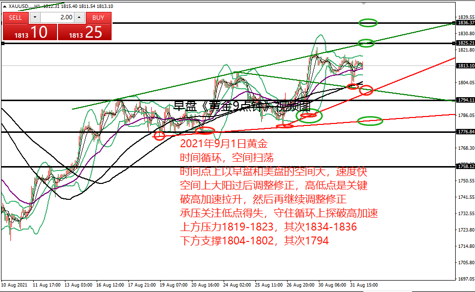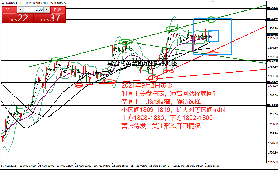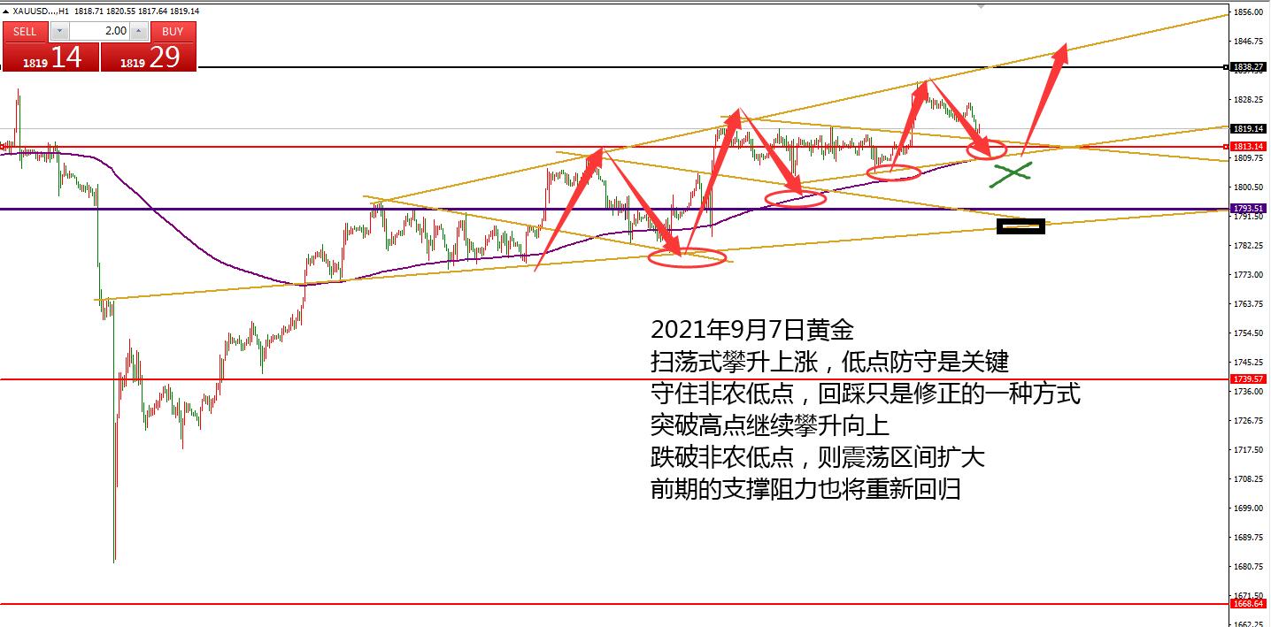 何小冰:黄金震荡修正,非农低点是关键 09.07 黄金在上周继续延续了8月份的行情节奏, 则不得不让我们考虑在上周五再度出现大阳拉升过后,接下来的延续性问题, 因此在昨日的文章分析中,以及今日的早盘《黄金9点钟》都重复提及了两种行情的节奏思路: 第一种是保持原先的节奏, 大阳拉升,调整修正,回踩支撑,防守低点,再加速攀升,破高又是大阳。这里需要关注回踩起涨点1813和防守低点1809的位置,以此作为行情的分界。 第二种延续性的行情,强 势不深调,不会深调太多,配合周一美国劳动节休市的影响,持续高位横盘,然后周二早盘延续冲刺拉升,破高切换区间。 今日周二,早盘黄金 依托1821-22区域的支撑