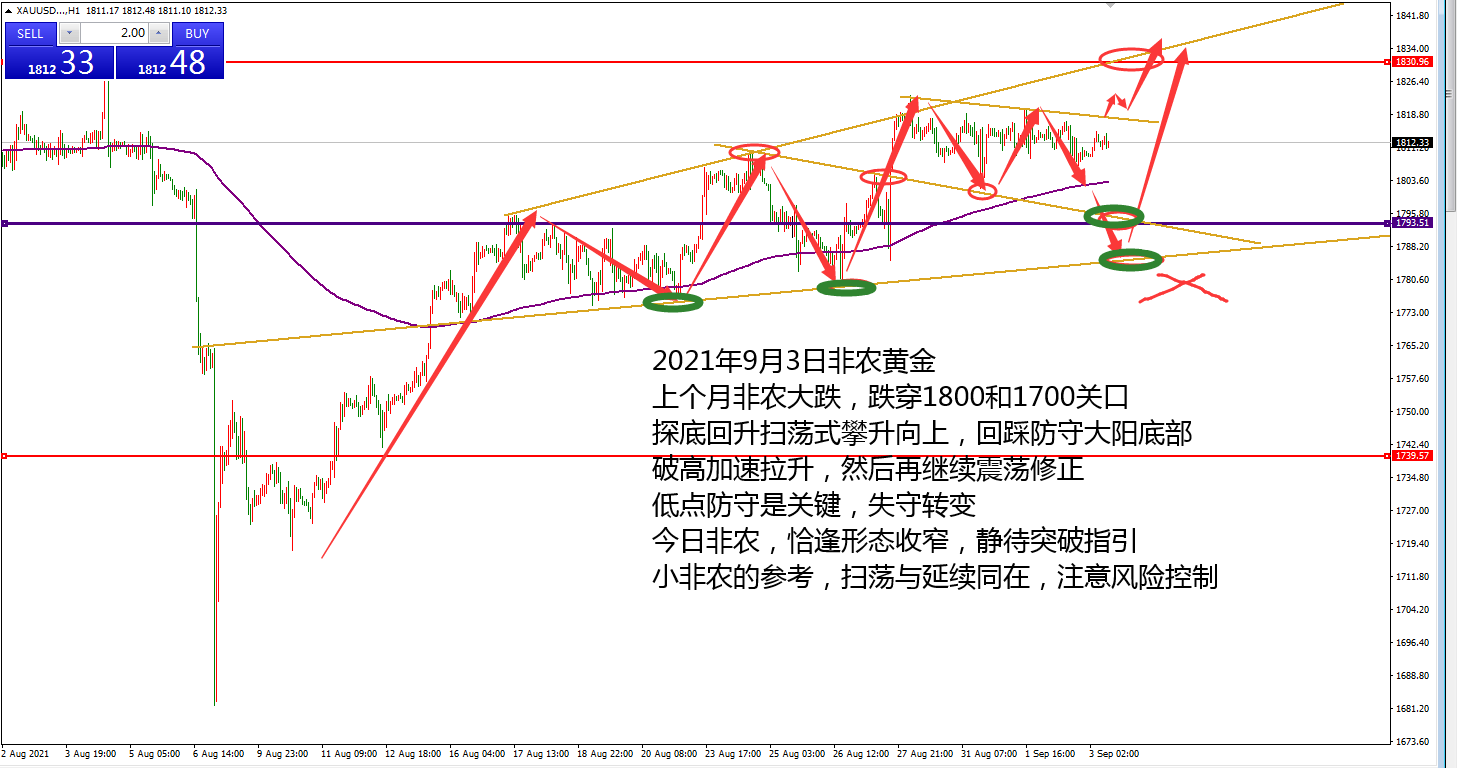 何小冰晚盘分析,黄金围绕1785-1815高空低多 09.08 黄金在昨日周二大阴回落,收取近一个月的最大跌幅 ,将上周五的涨幅尽数收回,这也是近一个月比较少见的了,从8月的非农急跌过后,价格开始形成探底回升的走势,扫荡式向上攀升走高,9月份的非农加速冲刺前期的高点1834位置。 本周周一由于休市横盘调整修正,周二则在机构批量空单,美债收益率和美元上涨的打压,黄金跌破非农低点1809位置,进一步下探至1792区域,尾盘持续承压在1800关口的下方。 今日周三,黄金白盘反弹承压1801位置进行调整修正,现在来到晚间时段, 也仍是处于此处的下方区域,以极弱对待,午间欧盘前会有二次破低的动作,然而