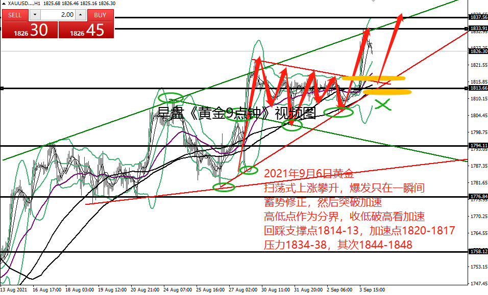 何小冰:非农利好黄金破高,区间切换还有震荡性 09.06 在上周反复提及到8月份的循环特色, 除却月初非农行情影响,价格急跌失守1800和1700两大关口,然后开始这一轮的探底回升走势的行情, 大阳拉升,随后调整几个交易日,守住大阳底部,突破高点再度大阳拉升,然后再进行调整修正 ,循环上涨,在此过程中,调整修正以不破大阳低点,然后蓄势过后,再度拉升破高开始加速冲刺。 在上周的行情中继续维持这样的 扫荡特色 ,前一周的周五大阳拉升,然后上周前四个交易日保持扫荡式运行修正,美盘扫荡,回踩确定加速点位置,然后向上攀升, 借助非农利多黄金的影响,趁机突破周初的高点1819和1823的压力 ,加速攀升