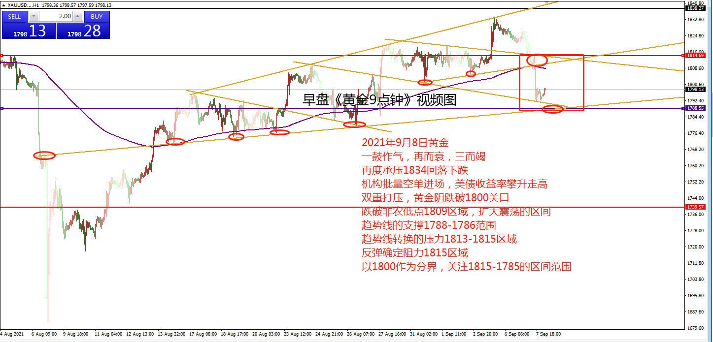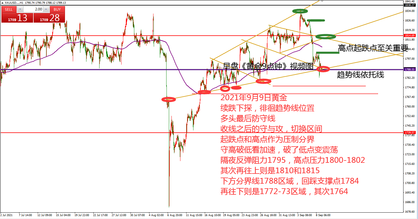何小冰:黄金低多如愿盈,晚间仍是1815-1785区间 09.09 黄金本周由于周一的休市横盘调整,行情波动从周二开始启动,整体节奏上偏向于, 白盘确定阻力,欧盘反复确定阻力,美盘承压下跌,破低点进一步走跌放量,尾盘探底回升进入修正调整 ,当然这过程中的美盘下跌均是通过机构单方面批量空单进场影响的。由机构介入,借助美元反弹打压黄金进一步下跌走低。 黄金也在本周周二周三接连下跌,跌破非农低点1809,再破1800关口,昨日破位1790关口,进一步下探至前期的趋势线位置。 而今日的早盘《黄金9点钟》的分析中也提及的价格徘徊趋势线的位置,对于今日的黄金来说,最关键的就是此处的得失, 守住价格向上寻