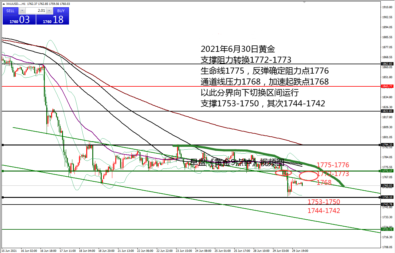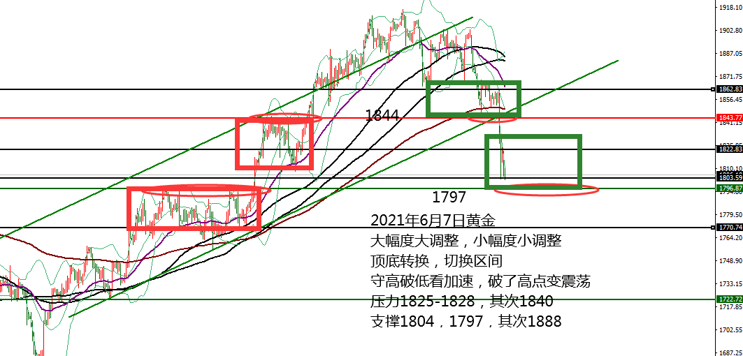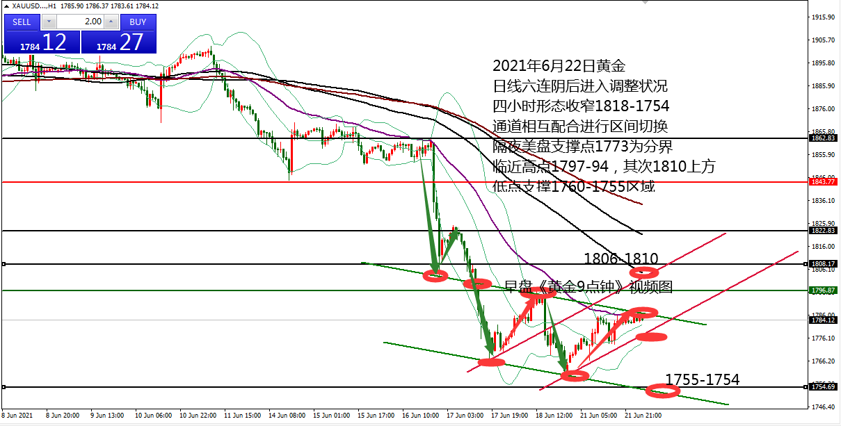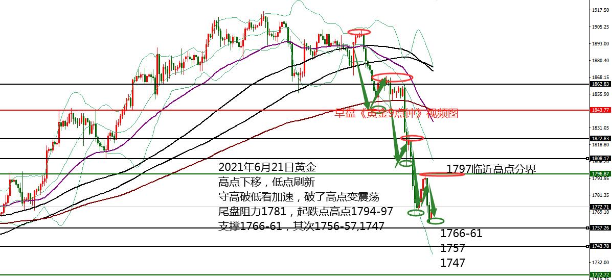 何小冰:黄金1772分界,扩大震荡区间 06.21 在早盘的《黄金9点钟》提及黄金上周由于受到消息的影响,呈现急跌下挫 ,周四凌晨美联储宣布可能提前加息的消息,令黄金等贵金属产品遭遇抛售,黄金更是刷新2020年3月份以来的最大单周跌幅,美元趁机站上92关口。 日线黄金呈现高点下跌,低点刷新的走势,那么对于后续的节奏中,需要重点留意高点和起跌点的防守,守高破低看加速,破了高点则转为震荡。 上周五的高点和起跌点重合1794-1797, 日线双线压力1795-1815同样在此区域成为压力, 因此周初最重要关注的便是重合的压力点1794-1797区域,也是重要的黄金节奏分界线。 而 上周明显的承压前