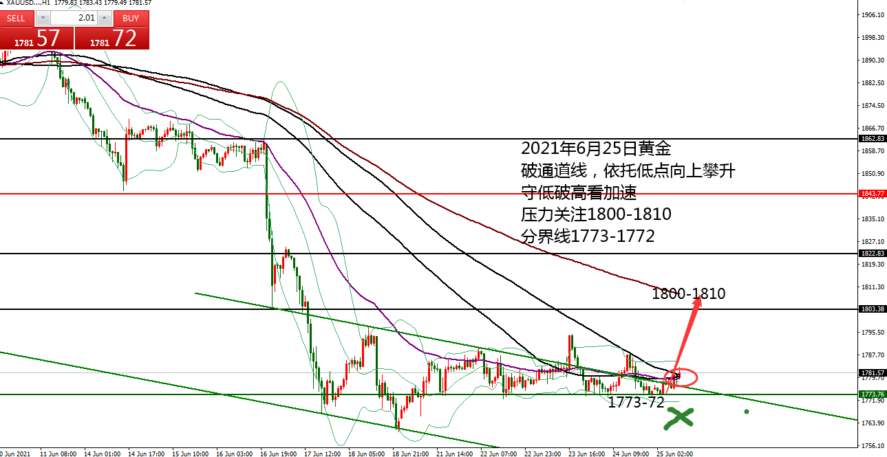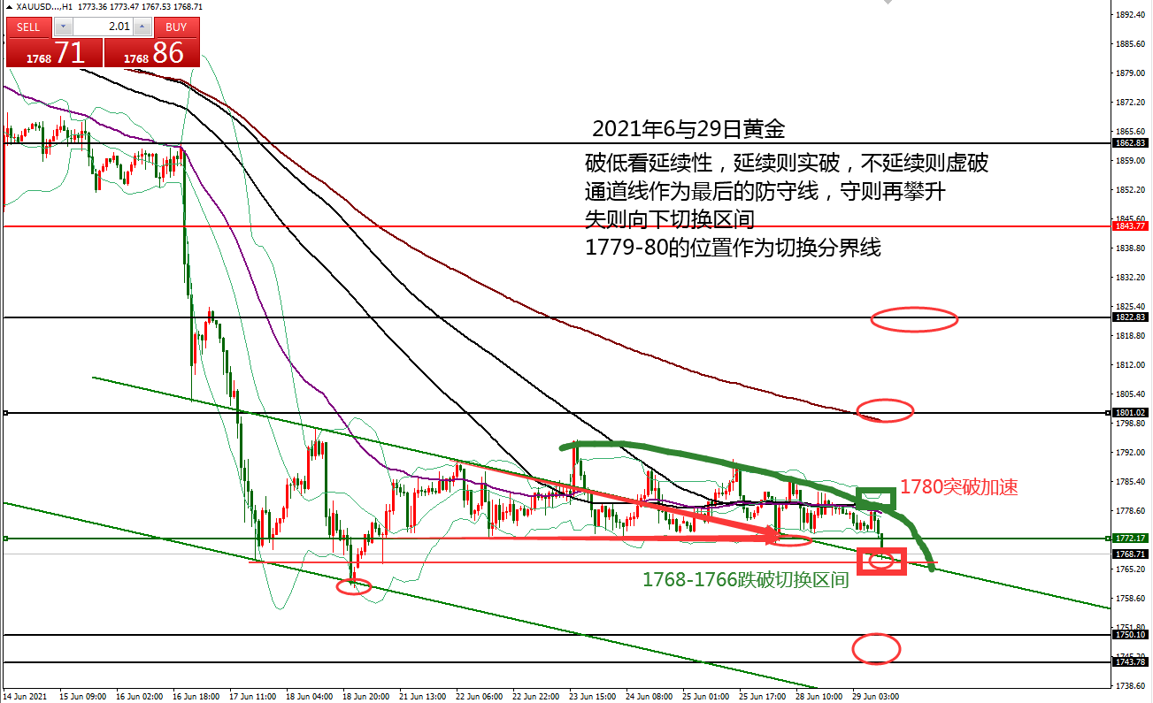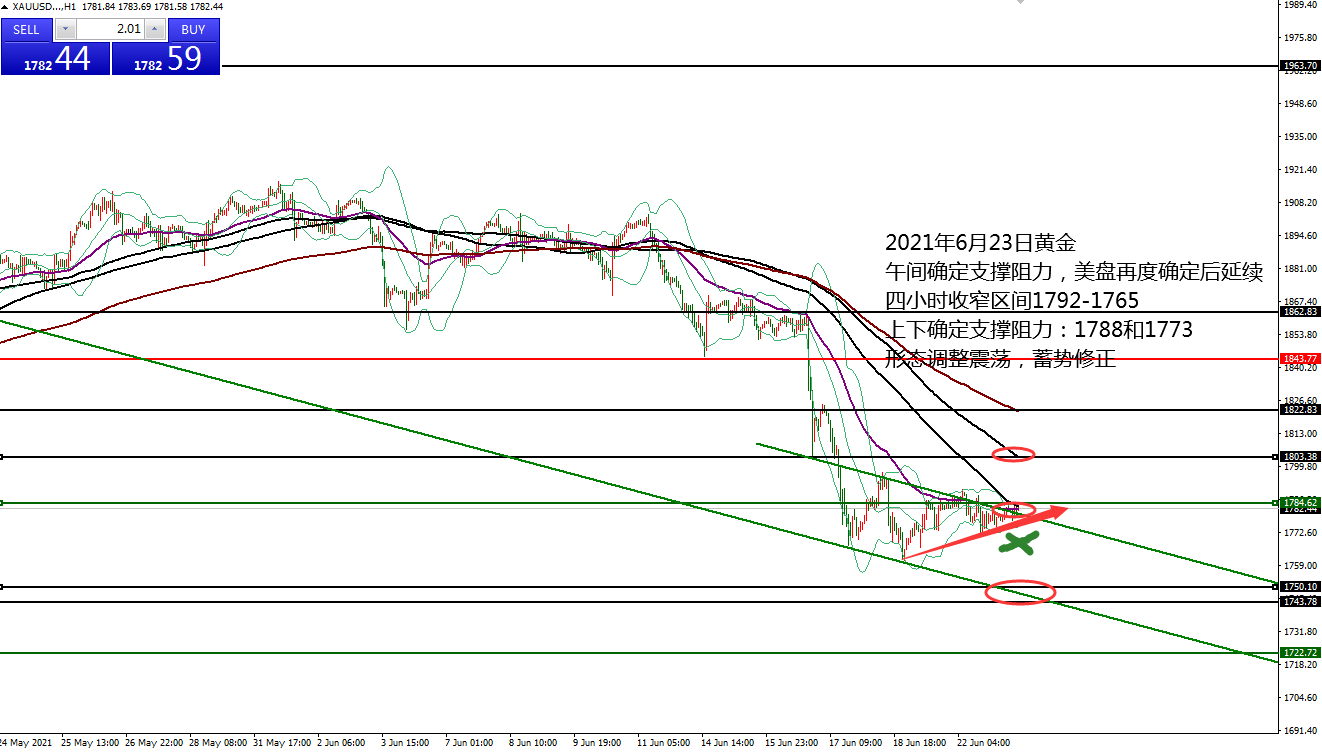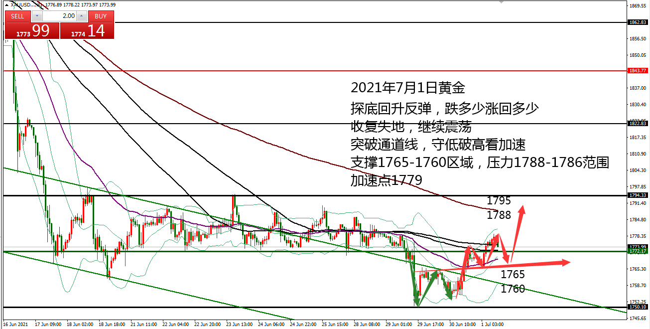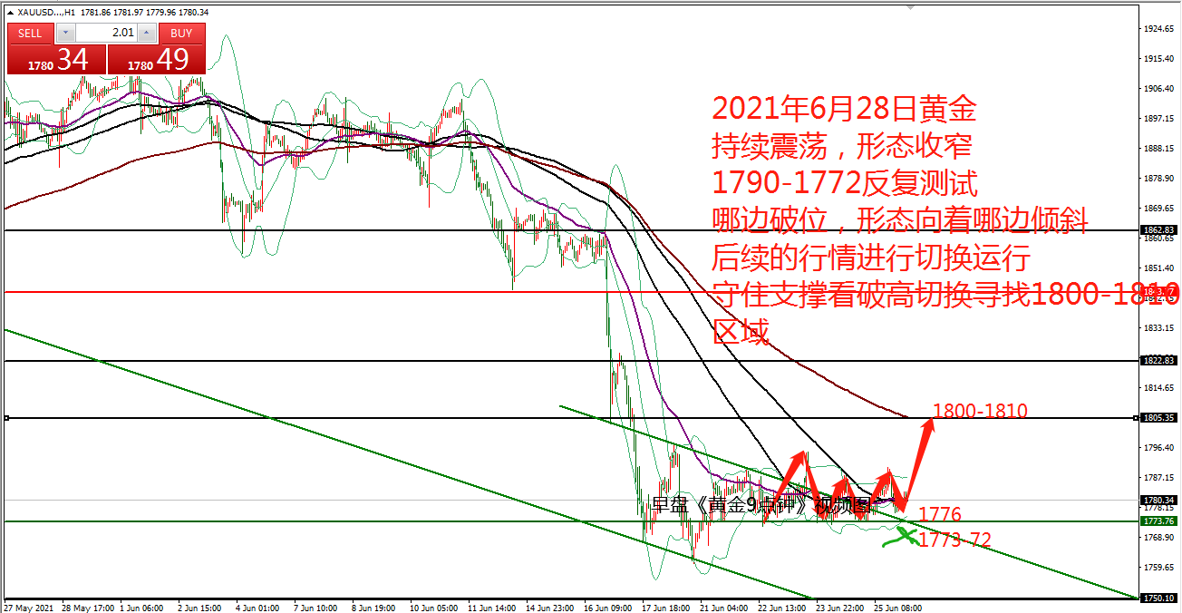 何小冰:黄金早盘低多盈利,1790突破加速攀升 06.28 早盘的《黄金9点钟》中针对关键的支撑阻力位置进行罗列,并且点出黄金在上周持续横盘收窄区间后,将选择权留给了本周 。 本周恰逢非农就业数据报告周,既有消息的影响,又有技术性的突破需要,无论如何选择,风险控制都是首要的。 早盘黄金承压1783下探至1770.6,触及下方的支撑同时也是通道线位置,再度获得支撑反弹回到1780关口,此点符合上周的震荡行情,围绕1780上下来回运行,下方反复测试支撑,上方反复测试阻力。 四小时布林带收窄区间1772-1790, 通道趋势线的位置也是在1772区域,今日早盘承压回踩确定此处的支撑,接下来能够震荡