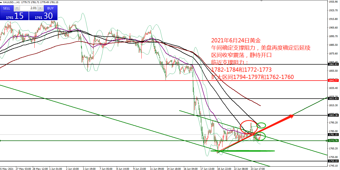 何小冰:黄金收窄区间,1784-1773待切换 06.24 黄金前面三个交易日进行区间调整修正,围绕着这个规律运行: 在午间确定的支撑阻力,将为美盘时段的参考做多做空提供点位,午间确定支撑点,则美盘回踩支撑点做多看涨反弹,午间确定阻力点,则美盘反弹阻力点做空看跌回落。 周一午间确定支撑 ,美盘再度回踩确定支撑后震荡反弹, 周二午间确定阻力 ,美盘再度确定阻力后震荡回落, 周三午间确定支撑 ,美盘再度确定支撑后震荡反弹,有点不同的是,尾盘冲高回落收复所有失地。 一方面是 美联储内部鹰鸽分歧较大影响黄金涨跌波动,鸽派言辞提振黄金,鹰派言辞打压黄金; 另一方面则是 上周连跌过后的技术性调整需求。