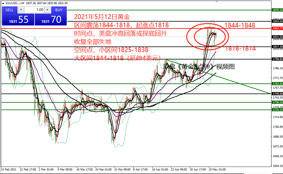 何小冰:4H形态收窄,黄金1848-1814继续高空低多 05.12 黄金周一续涨攀升,美盘加速破非农高点,但价格冲高回落,后续基本收复全部的涨幅;周二延续凌晨的回落下探,美盘时段先行反弹确定阻力,随后破低点1830关口,进一步扩大跌幅至非农起涨点1818,但价格探底回升,后续基本收复全部的跌幅。 两个交易日均是相同的节奏,也就是美盘时段破高破低过后, 后续的行情便是 收复此前的涨幅或跌幅, 将行情拉回区间震荡,有明显的震荡性,也就是不延续。 因此,需要重点留意美盘时段的冲刺动作 ,冲刺过后是否能够延续是重点,而在此过程中,起涨点和起跌点是重要的行情分界线。 空间点上,价格走震荡,所以还是在