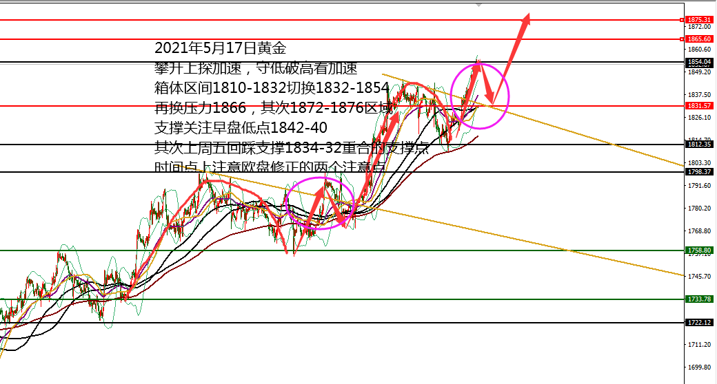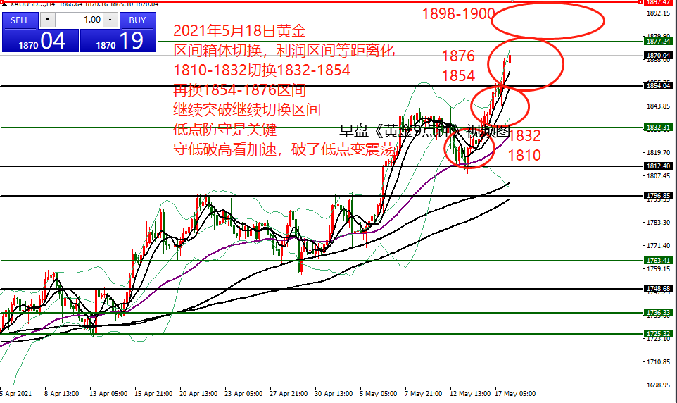 何小冰:黄金围绕1876-1832高空低多,破位切换 05.17 黄金在 5月第一周的非农周获得支撑强势拉升走高 ,非农当晚直接推升加速,而 第二周(上周)开局并没有直接延续 ,而是先进行空间扫荡,扫荡式运行,然后在周四周五形成上攻冲刺,尾盘高位收盘结束当周的行情, 最终周线还是收了阳线 ,只是过程是修正过后,然后再向上攀升的。 美元指数争夺90关口,令黄金在四月五月的整体走势上偏向扫荡,获得支撑则打压黄金,承压回落则支撑黄金 ,这样子的争夺还在继续,也就是会令黄金的整体走势偏向于扫荡,大起大落都是常事。 空间上的压力和支撑已经在上周罗列, 参考支撑阻力进行运行,突破切换区间,未破则保持该区