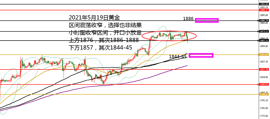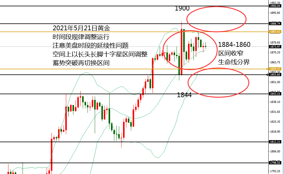 何小冰:美元徘徊低点,黄金1884-1860区间修正 05.21 黄金偏强势的走势被周三的长头长脚十字星打乱, 原本是守低破高走强势的攀升,却因为周三的过山车行情,陷入了震荡调整的区间,而区间范围便是长头长脚十字星的高低点1890-1852区域。 昨日周四也是围绕这个区间内进行运行调整,然后参考本周不太明显的时间段规律进行震荡调整。 本周的时间规律是以时间段为主的:欧盘回踩确定支撑,美盘加速冲刺,破高延续再冲刺,破高不延续走震荡。 按照这个规律: 周一 欧盘承压回踩1844,美盘探底回升突破新高,延续继续攀升, 周二 欧盘回踩1865,美盘探底回升突破新高,冲高回落走震荡, 周三 欧盘回踩1