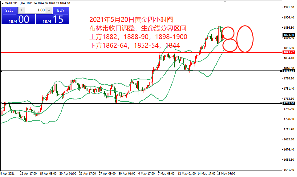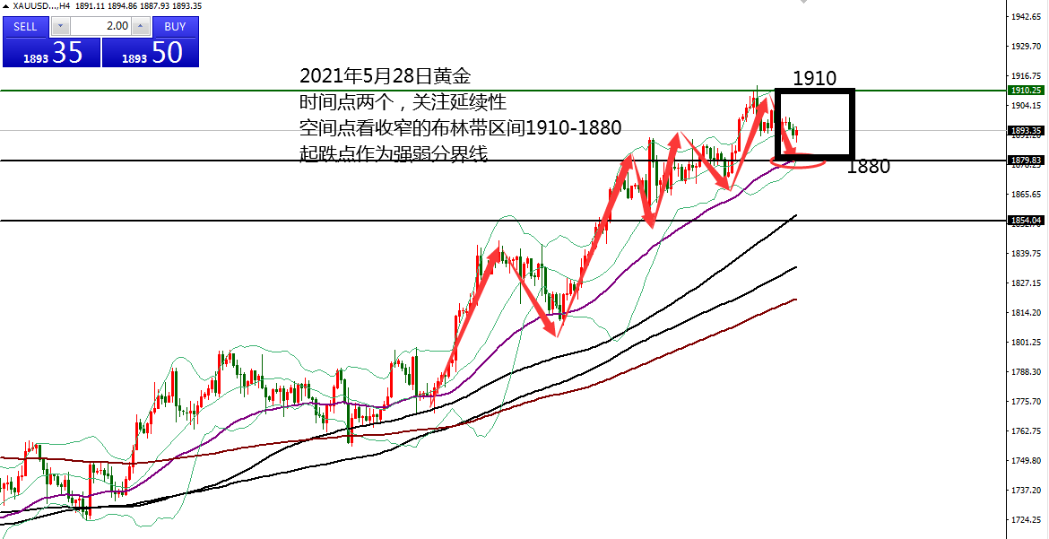 何小冰:美元再走低,黄金还是收窄区间蓄势 05.25 美元指数已经在频频走低,黄金却始终没有打开高位横盘的区间,久攻不破,再有冲刺就需要进行借力了。 在今日早盘的 《黄金9点钟》中提及到上方1890关口的反复测试,同时四小时布林带形态收窄区间 ,两者相互满足条件,也 就是在突破之后,伴随着形态的开口,指引一波行情方向,而四小时的开口区间会更大。 因此,在后续的行情中需要注意的是,实现突破之后,形态开口则看区间切换,这一点可以先记下来。 然后再来谈及一个黄金反复高位横盘的问题 ,想要直接冲刺,高位横盘是一种方法,但持续性的高位横盘,反而容易动力不足,从而变成久攻不破终须回落,亦或是冲高之后动力
