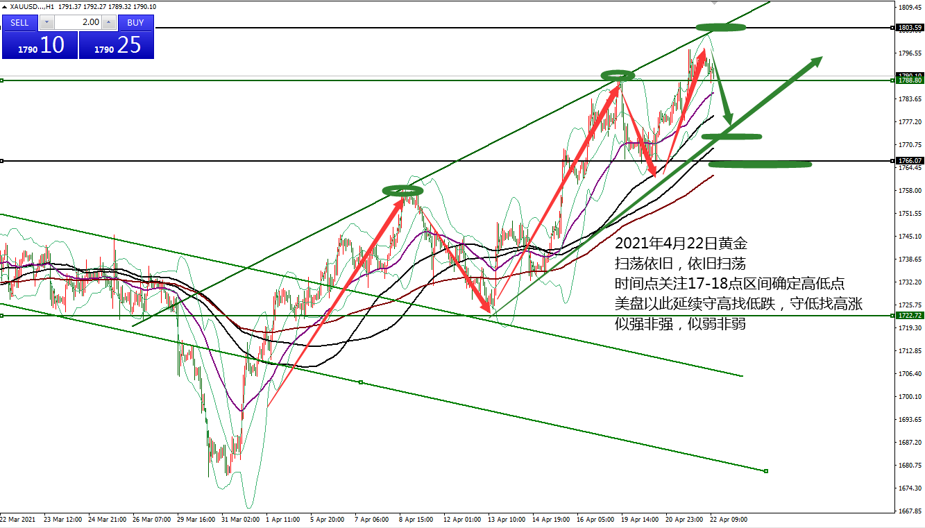 何小冰:黄金1797压制三次空盈,时间点定美盘区间04.22 扫荡依旧,依旧扫荡。这句是本周一直在说的。 本周开局便是扫荡, 周一欧盘续涨破高,美盘冲高回落收复涨幅,守高破低下跌; 周二欧盘续跌破低,美盘探底回升收复跌幅攀升,守低破高上涨; 周三也就是昨天,先是续涨攀升寻找高点,在欧盘时段提前完成回踩的动作,没有破低点,再度攀升到高点突破拉升,这过程有机构两次批量砸单累计9亿美元的资金进入的推升助力,守低破高上涨。 简单来说,本周的扫荡很明显,但规律并不是那么明显,似强非强,似弱非弱, 同一个点位可以多次成为支撑阻力,又不能多次成为支撑阻力,这也为参与增添了难度。 信号不明显,明显信号容易是