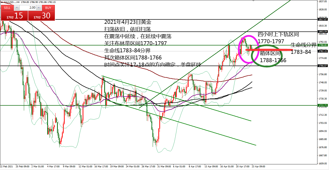 何小冰:黄金扫荡依旧,注意灵活应对 04.23 兜兜转转,最终黄金还是不改震荡,在震荡中延续,在延续中震荡。 周一 欧盘续涨破高,美盘冲高回落收复涨幅,守高破低下跌; 周二 欧盘续跌破低,美盘探底回升收复跌幅攀升,守低破高上涨; 周三 欧盘回踩确定支撑,美盘依托低点探底回升攀升,破高加速冲刺,尾盘冲高回落,守低破高上涨; 周四 欧盘承压回落破低,美盘防守高点压力继续走跌破低,守高破低下跌。 行情扫荡明显,规律却并不是那么明显, 似强非强,似弱非弱,而我们能够找到的就是一个高低点以及时间点的转变规律,但还得谨防震荡特色,也就是不延续,第二次容易是坑。 以晚间17-18点确定的高低点作为美盘方向