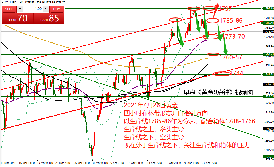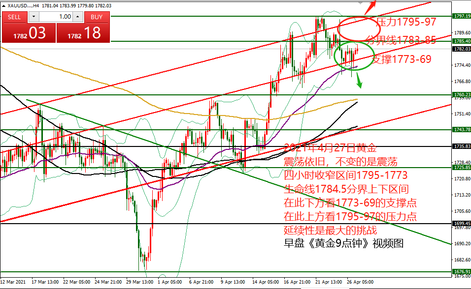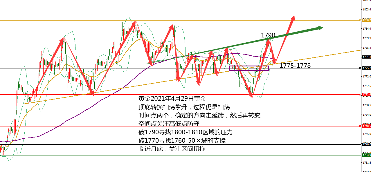 何小冰:黄金看破1800,加速冲刺结束4月份 04.29 今日凌晨2点美联储宣布维持当前利率不变,并暗示经济好转和通胀上升并未影响美联储在一段时间内坚持现行宽松政策与购债计划,在此消息公布后,黄金价格并未有太大的波动,而是围绕1770-1777进行来回震荡,随后鲍威尔召开新闻发布会,阐释了自己对于经济复苏的担忧,市场解读为“鸽派”信号,促使黄金短线拉升走高重回1780关口的上方。 今日早盘黄金延续上涨,攀升冲刺1790关口,不过午后冲高回落再度回踩1780关口下方的区域。 越是临近月末收官的时候,黄金的波动性越乱,基本上在本周同样是扫荡,冲高回落,探底回升相互配合。 时间点上两个时间点确定高