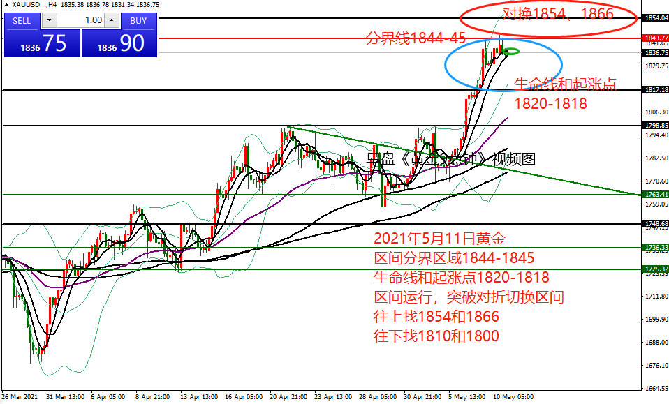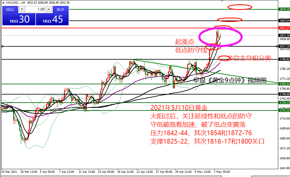 何小冰:黄金先空后多,看大涨后的空间修正05.10 大涨大跌过后,价格又再度陷入调整的状况,现在已经来到欧盘时段,黄金围绕1830-1840区间进行调整, 在早盘《黄金9点钟》中提及到延续性的问题以及高低点的防守。 节奏上有两种,一种是强势,一种是近期的震荡扫荡行情。 而近期比较常见的就是大涨大跌过后,先进行调整修正 ,蓄势然后再进行加速,这过程中是伴随着反复测试高点未果,最终承压回落的动作的。 上周比较明显的时间规律 是白盘先涨,欧盘就得多看涨,美盘续涨攀升,白盘先跌,欧盘续跌,再做多得等美盘,参考这个节奏走了两个交易日的修正和三个交易日的延续行情,区间向上攀升将近78美元,箱体从1766