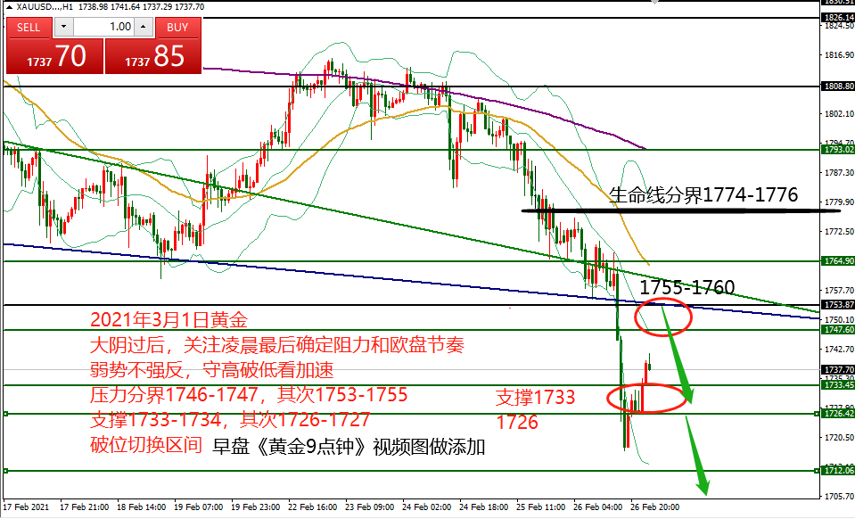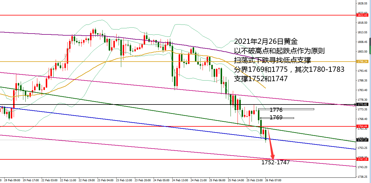 何小冰:闹元宵,黄金以不破高点为下跌前提 02.26 本周由于股市的波折,美元指数90关口抉择影响,黄金走势更加明显波折,在扫荡中的行情需要进行划分,每个时间段对应的不同的涨跌。 在昨日周三通过细分,规划出三个下跌的时机点,以及两个上涨的时机点 ,在对应的时机点中,参考支撑阻力对应套用即可。 除了周一的反弹是比较强势,节奏不同以外, 周二开始基本是以反弹不破起跌点和高点作为压制向下回落走 跌,期间有反弹的动作,美盘时段以反弹不破高点,然后确定阻力向下下跌,破低之后在出现第二次的上涨机会,尾盘确定阻力再下跌。 总结来说,便是反弹不破高点作为原则 ,守住高点和起跌点的压力,反弹给到的便是做空的机