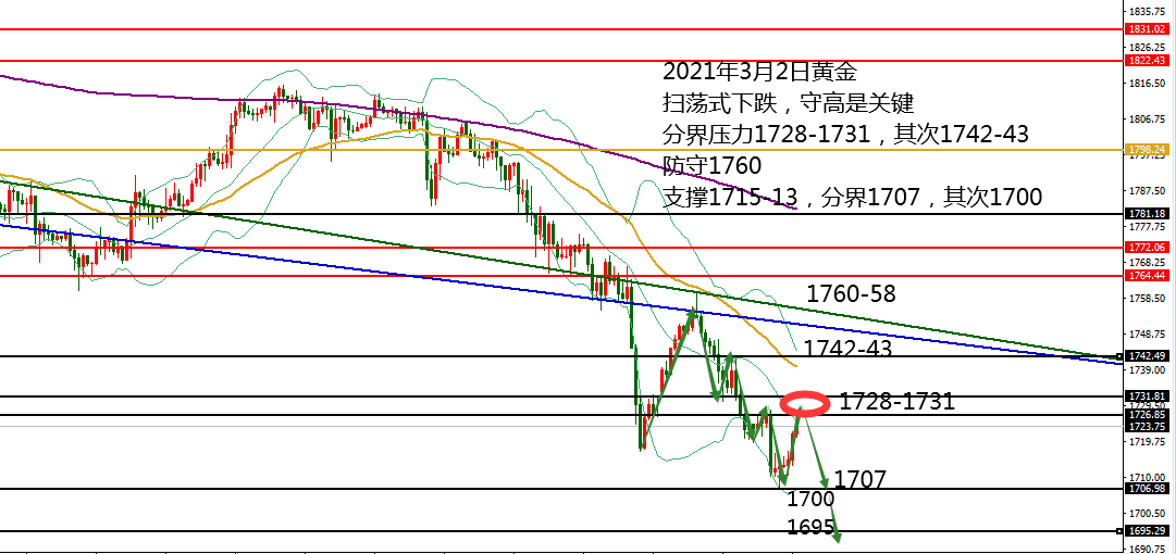何小冰:黄金守高是下跌的关键,1728分界区间 03.02 黄金本周刚开局便已经下跌了将近57美元 ,周一先行反弹走高,确定1760的压力,开始扫荡式的回落,凌晨再确定阻力1743继续走跌,今日早盘小幅反弹1728.5后放量走跌,破低点,刷新新低1707。高点下移,低点刷新,扫荡式向下。 在此过程中,下跌靠反弹借力,上涨靠探底反弹,也就是过程比较扫荡性,不延续是最大的特色。 空间范围也比较大, 均是在20美元以上,40美元以下 ,这就决定了,在点位和区间选择上需要注意,选择中间位置,则左右为难,只有相对压力和相对支撑的位置才能够有较好的利润点。 在早盘《黄金9点钟》提及关注日内的反弹修正力度