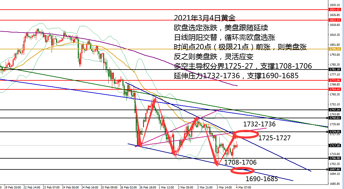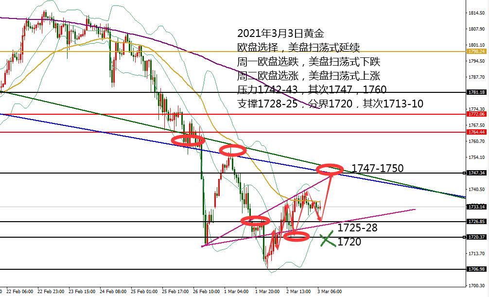 何小冰:黄金欧盘选择涨跌,美盘扫荡式延续 03.03 黄金周一周二走势刚好是相反的, 周一早盘延续前一个交易日尾盘的探底回升 ,反弹走高,欧盘确定高点1760开始承压回落,美盘破低后再反弹确定阻力1742-43区域,尾盘承压继续回落破低寻找低点区域。 周二早盘延续前一个交易日尾盘的冲高回落 ,直接破低下跌,欧盘确定低点1707开始震荡反弹,美盘破高后回踩支撑1720,尾盘依托支撑继续攀升走高破高寻找上方的压力。 时间点相似,走势上却是相反的。 当然, 这过程中有美元的影响因素 ,周一美元指数反弹重回91关口上方,周二美元指数承压跌回91关口下方,扫荡运行依旧,也促使黄金的走势来回扫荡运行。