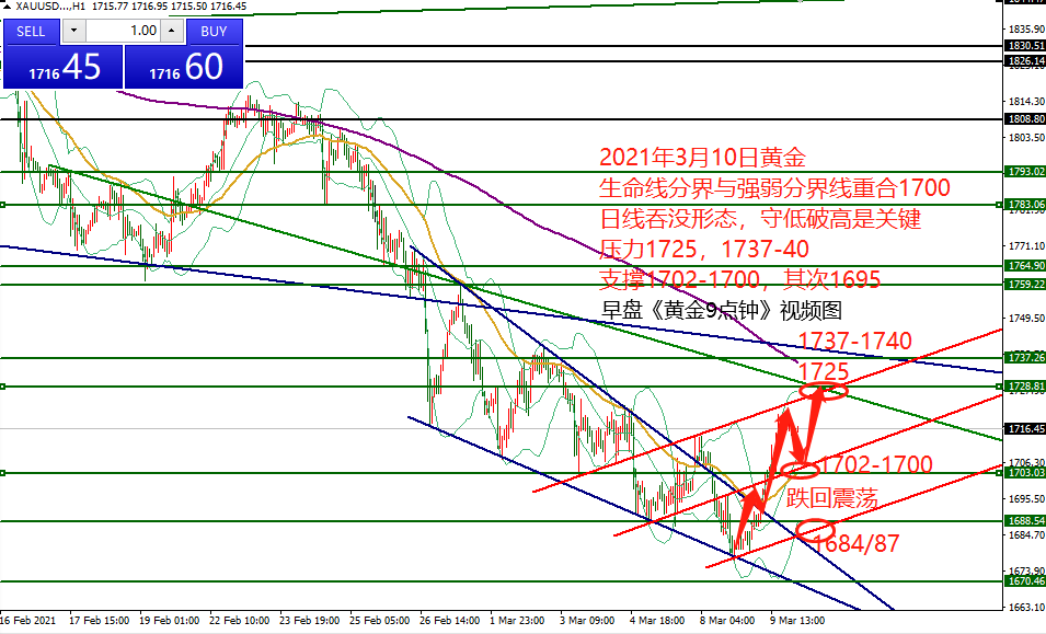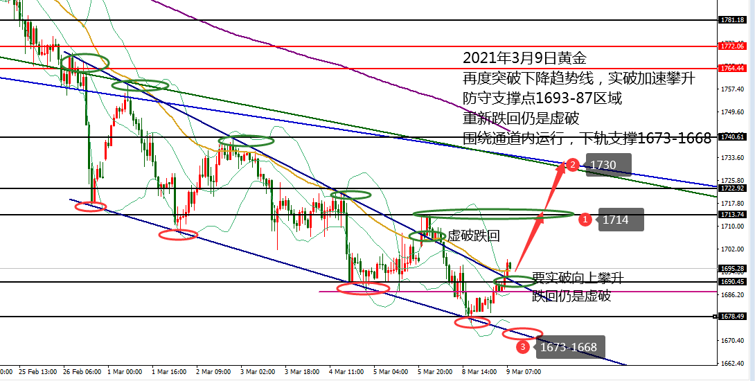 何小冰:黄金再破趋势线,守住加速攀升 03.09 一场抛售在多个产品上显现, 黄金也是最明显的抛售,由于十年期美债收益率以及美元的攀升,黄金在周一承压下跌,午夜前后再放量一次,刷新近期低点1676.8,刚好触及近期的下降趋势线的下轨支撑位置获得支撑。尾盘持续横盘1685-1680修正。 今日周二早盘下探1680支撑开始探底回升反弹,截止欧盘前后攀升逼近1700关口 。 从 昨日以及早盘的《黄金9点钟》都在提及趋势线位置分界作用 ,趋势线之上,多头掌握主导权,趋势线之下空头掌握主导权, 现在价格再度站上上周的下降趋势线上方 ,能够守住趋势线,维持昨日的思路, 价格将依托趋势向上寻找起跌点的压力