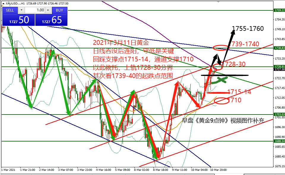 何小冰:黄金慢牛攀升,守低是关键 03.11 黄金本周的行情节奏在于,选定了方向,美盘便是延续的动作, 周一冲高回落,防守高点震荡回落走跌38美元,周二探底回升,防守低点震荡反弹上涨40美元,周三防守前一个交易日美盘的起涨点,回踩确定支撑后,以时间换取空间,在突破高点后,修正继续攀升上涨,尾盘慢牛攀升。 也就是,欧盘选定的方向,美盘延续对待,关键一点守住起涨起跌点作为分界。 日线级别继2月23日之后首次出现连阳状况 ,在吞没形态后收取阳线,且在今日周四继续延续攀升走高, 那么接下来的关键便是守低,守住低点还将继续攀升寻找前期的起跌点和压力区域。 早盘的《黄金9点钟》提及1730-28 是日内