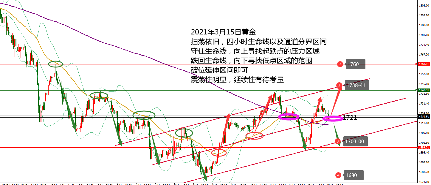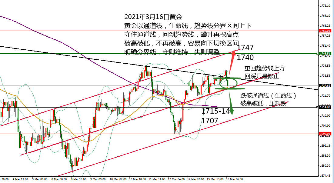 何小冰:黄金生命线分区间,欧盘涨跌很重要03.16 美联储将在周四凌晨2点(周三晚上)召开货币政策会议纪要,而在此之前,市场草木皆兵 ,希望通过已知的经济数据和消息提前获得美联储的规划,美债收益率的波动较为剧烈,周一也因为十年期美债收益率有所回落,提振黄金反弹,而美元指数则是承压92关口下方修正调整。 在重磅消息公布之前,预计行情会偏向于震荡为主,震荡过程中,要注意的是区间的切换 ,也就是向上的区间切换,还是向下的区间切换。 如何分界切换的区间? 在昨天的分析中,我们给出了四小时图的生命线,今天的分析中,给出了 趋势线以及通道线(生命线重合了)。 昨日以生命线作为依托看涨攀升盈利,现在生命线