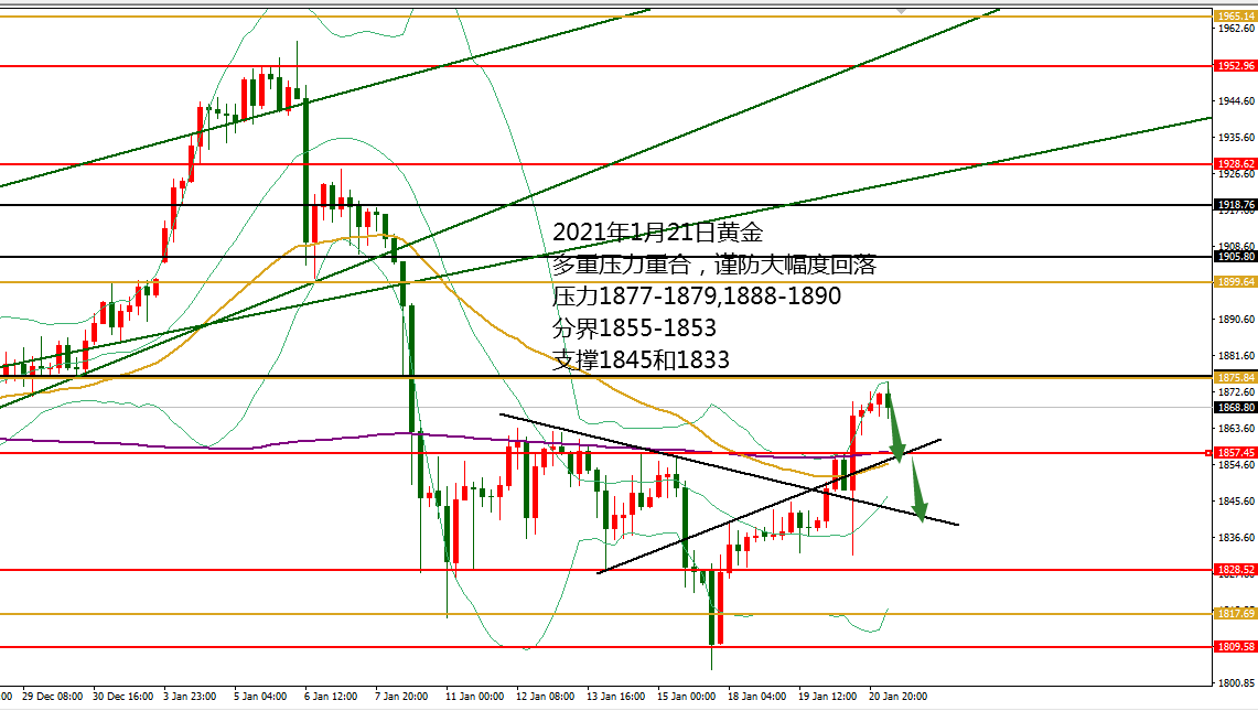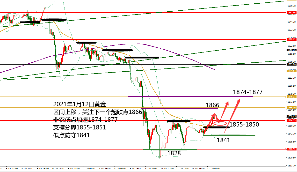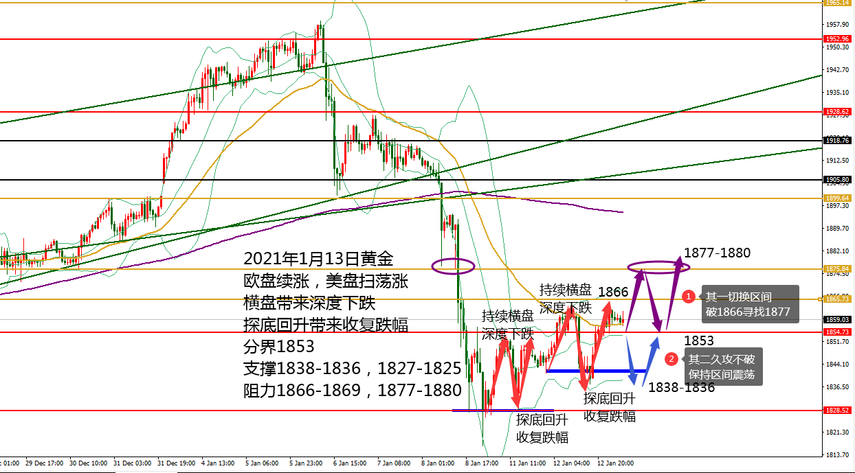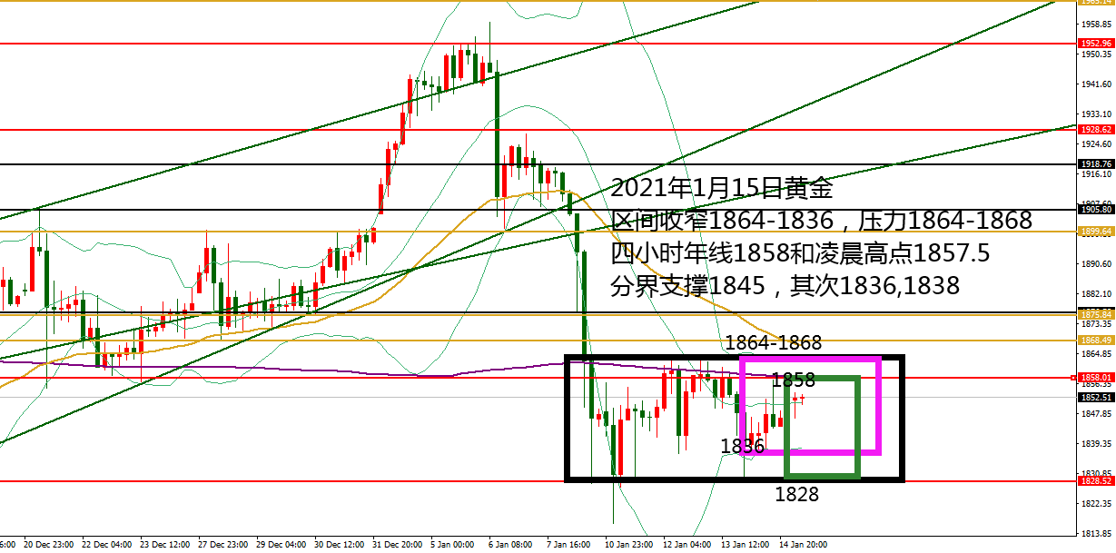 何小冰:黄金形态未开口,震荡静待开口放量01.14 美债收益率成为最近的市场牵动因素,美债收益率涨,黄金跌,美债收益率跌,黄金涨。 而在周三由于美债收益率结束六连涨开始有所回落,黄金反弹测试高位横盘,但今天早盘形式又变了,对于即将上任的美国当选总统拜登关于新一轮的疫情刺激计划中,原定计划是1.3万亿美元,但在今天早盘的消息则是可能达到2万亿美元,此消息公布后,美债收益率短线走高,促使黄金在早盘承压下跌至1828区域。 今晚19点15分拜登将召开新闻发布会, 届时公布的信息结果将对市场产生直接的影响,引发较大的行情波动,需要密切进行留意。 在周一从大周期到小周期的分析中提及1864-1866的