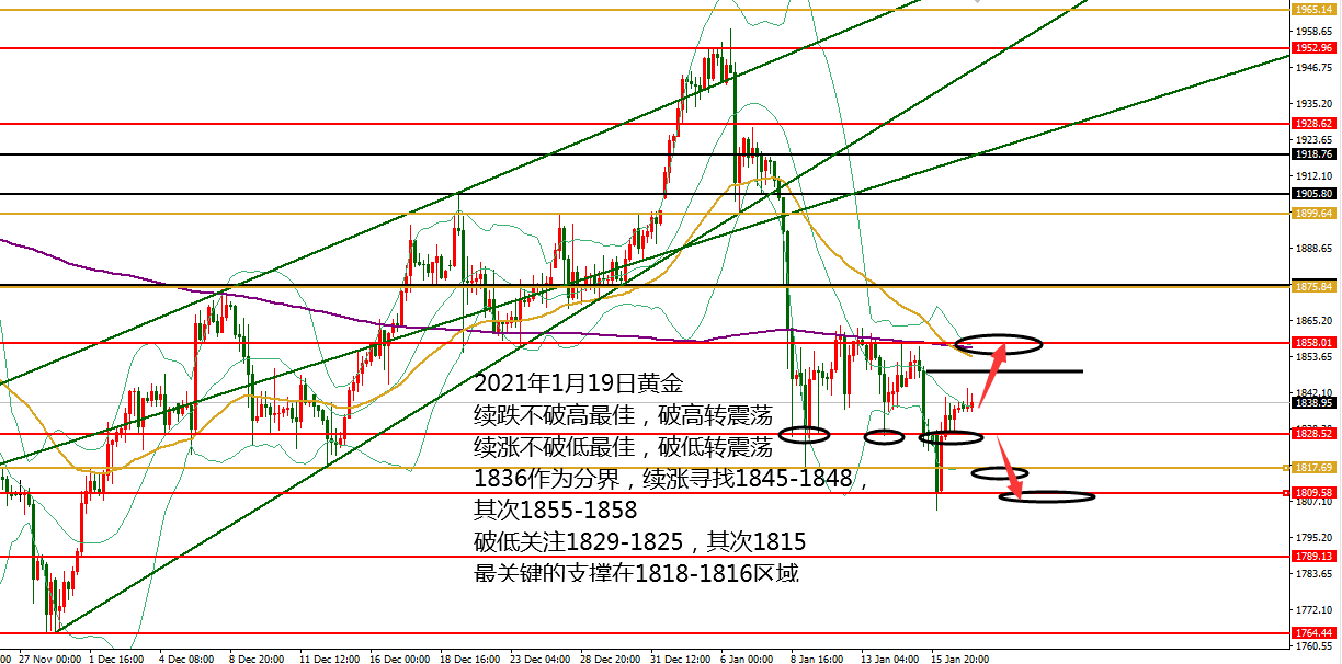 何小冰:黄金周四谨防大幅回落,高低点是关键01.21 风平浪静,顺顺利利完成交接,拜登宣誓就职,正式进入拜登时代,老特让世界失望了,相信后续很有很多“瓜”出现。 接下来市场更多关注拜登政府能否控制住疫情,以及国会能否通过1.9万亿美元的财政救助计划,美国经济如何恢复等方面。后续持续关注留意消息动态。 黄金自周一形成 探底回升后,保持扫荡式向上攀升的节奏,美盘时段的回踩确定支撑 ,基本稳守支撑再向上攀升突破高点测试上方的区域。 周一美盘回踩支撑1829,尾盘走高次日破高;周二美盘回踩支撑1833,尾盘走高次日破高,周三美盘回踩支撑1832.5,当天就破位高点续涨攀升。 时间点21点前后非常关键