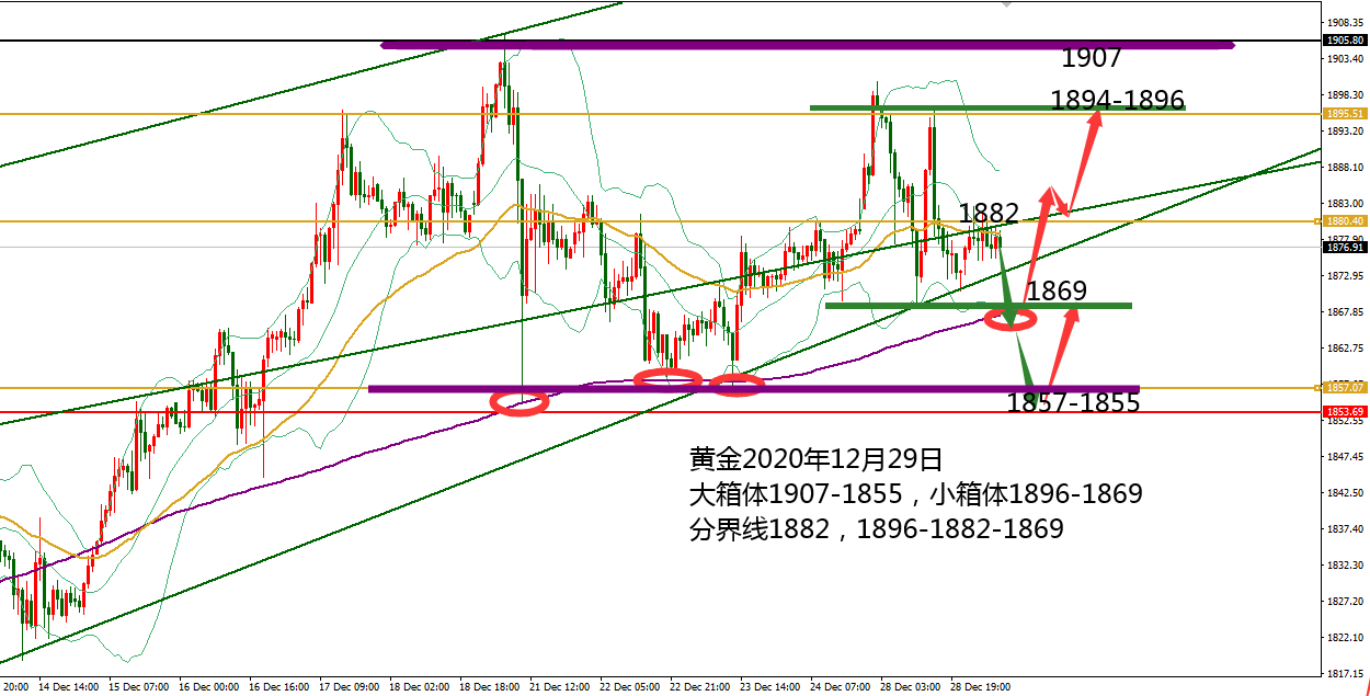 何小冰:黄金1876-1900震荡跨向2021年 本周的黄金比起上周更加波折, 一是波动幅度比较小,二是横盘时间更长, 虽然最终走势上复制上周的行情,却在过程中备受折腾。 周一先涨后跌锁定区间1900-1869进行横盘 ,周二周三持续围绕魔性的1880关口进行来回震荡,触及压力回到此区域,下探支撑回到此区域,直至昨晚周三下探1876最终获得支撑才正式向上攀升测试,今日早盘延续再度测试1900关口。 可能到这里会觉得节奏终于还是要转为向上了,然而这里又有矛盾点: 一是昨晚提及的美元持续走低,黄金没有借势头直接拉升,上涨比下跌更加艰难;二是攀升未能一鼓作气直接站稳1900关口,仍是处于大小箱体区
