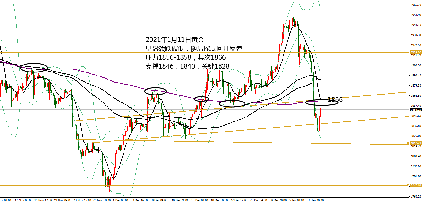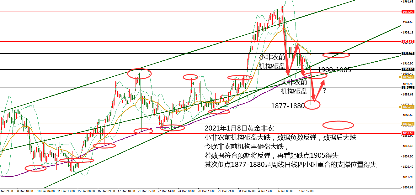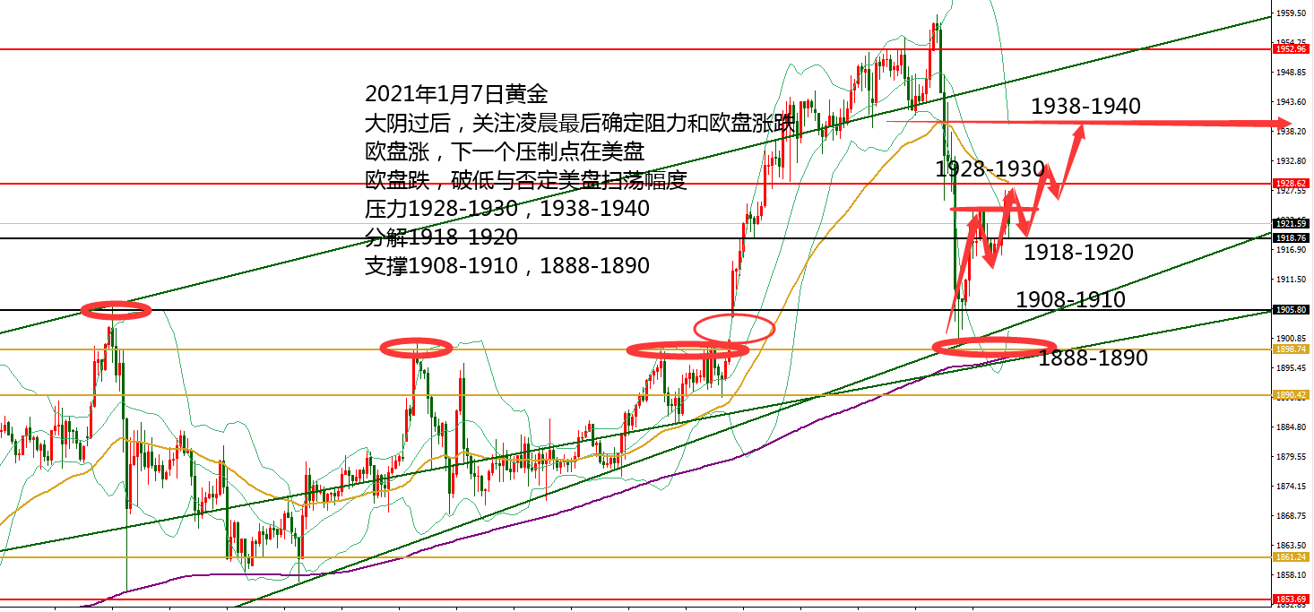何小冰:黄金回补缺口是多头的结束?还是新的开始?01.07 一场风雨过后,黄金又回到原点,可惜早已物是人非,前面扛空的人已经变成扛多的人,愿扛单的路上没有你。 周一跳空高开高走强势攀升 走高刷新新高1945, 周二延续震荡攀升 走高刷新新高1955, 周三走来回大扫荡 ,亚盘破高1955承压走低至1941,欧盘探底回升破高上探1959,美盘冲高回落下跌力度加大,加上机构砸盘,短线下探至1925,小非农ADP数据录得负数,利好黄金探底回升确定1943的阻力后再度测试低点,进入晚间22-24点的下跌时间段,跌破1825后放量下跌,最低触及1900关口。 到这里还没结束,尾盘受到华盛顿的动乱影响