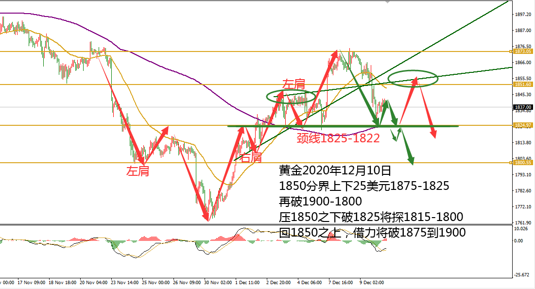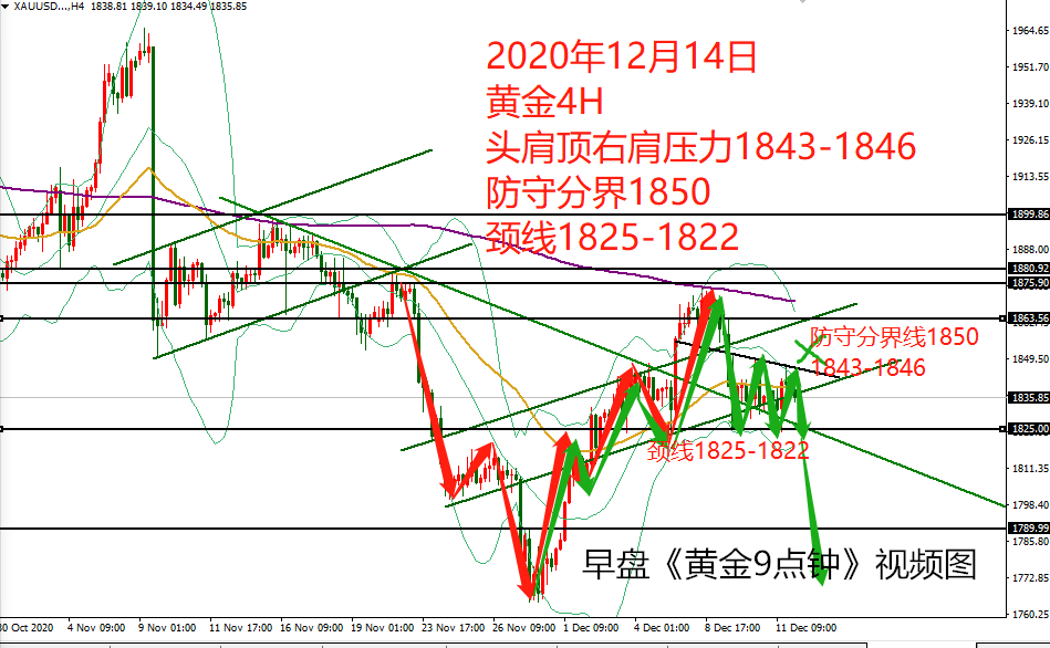 何小冰:黄金颈线再涨,1835看涨扩大区间 12.15 本周消息面围绕美联储利率决议、疫苗以及财政救助计划进行,一个利多黄金,一个利空黄金,一个准备随时祭出“杀手锏”引领一波行情 ,现在一切未定,关注这三方面的消息都将通过价格进行反应显示。 当然,这在过程中,哪个消息占据主导权,价格行情就会倾向于哪个。 在今天早盘《黄金9点钟》提及整个行情向下倾斜,头肩顶颈线1825-1822反复测试多次 ,今日开盘仍是在此处上方,亚盘若是能够直接承压走低,将进一步下探寻找1800-1775区域,继续围绕时间循环,亚盘确定阻力,欧盘防守高点看空下跌。 前提条件便是不破高点1839-1840区域才是最佳的。