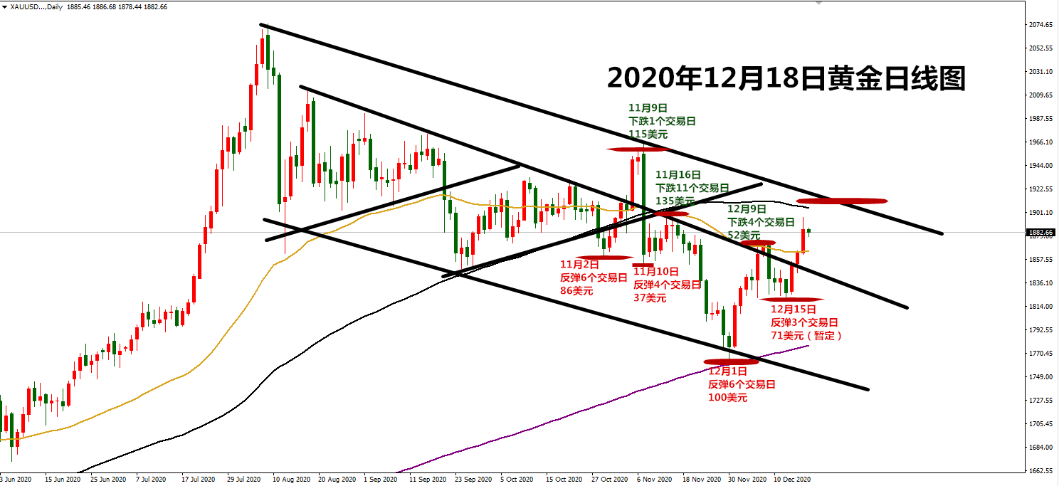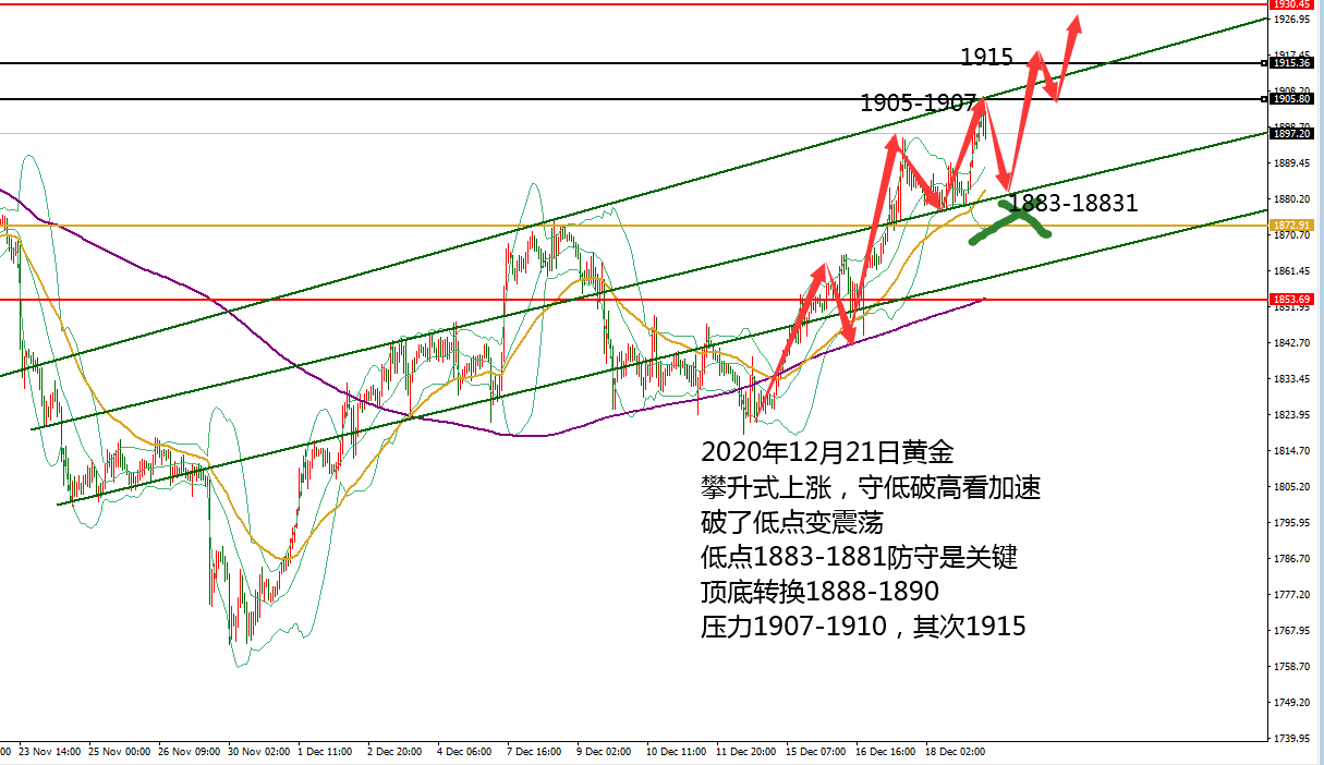 何小冰:黄金如愿破高,守低仍是关键12.21 美国财政刺激方案利好黄金从1825开始反弹向上,突破四小时紫色趋势线年线1864开始加速攀升, 今日早盘续涨,欧盘延续攀升1900关口上方,周末美国国会基本敲定9000亿美元的刺激方案,此消息已经提前在价格上显示,预计周一众议院投票表决通过后,利好再加速,行情将先进入修正, 也就是买预期卖实际的动作。 对于11月至今的黄金走势,在上周五的文章中有做提及 ,整体上以大涨大跌为主,涨跌过后行情不延续,空间较大,延续性仅限在运行当中的时候, 守低破高或守高破低,一旦高低点失守,行情节奏开始变震荡,再看连阳连阴与否做思路调整。 而上周较为明显的时间循环,