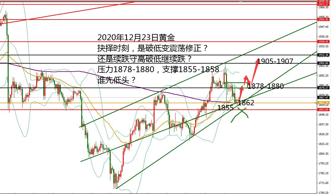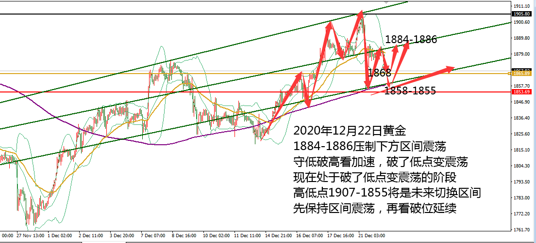何小冰:黄金圣诞周十字星高低点,区间修正 12.22 圣诞周的第一个交易日,市场上演过山车的行情, 同一个消息带来两个结果 ,美国纾困救助方案利好黄金攀升突破1900关口,也因为这个消息利多出尽变成利空,市场出现买预期卖实际的行情走势,从1900关口急转向下下探至1855区域,尾盘横盘1880关口调整修正。 今年50美元以上的行情一抓一大把,一旦没有做风险控制,赚的时候未必能够拿到全部的利润,亏钱的时候基本是从头到尾都齐全。 还是要强调12字投资真理,会进场,也要懂得离场,严格止损,控制仓位。 今日早盘 《黄金9点钟》 分析了两个行情节奏: 其一, 持续承压1884-1886下方 ,行情围绕