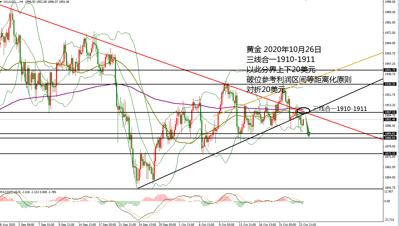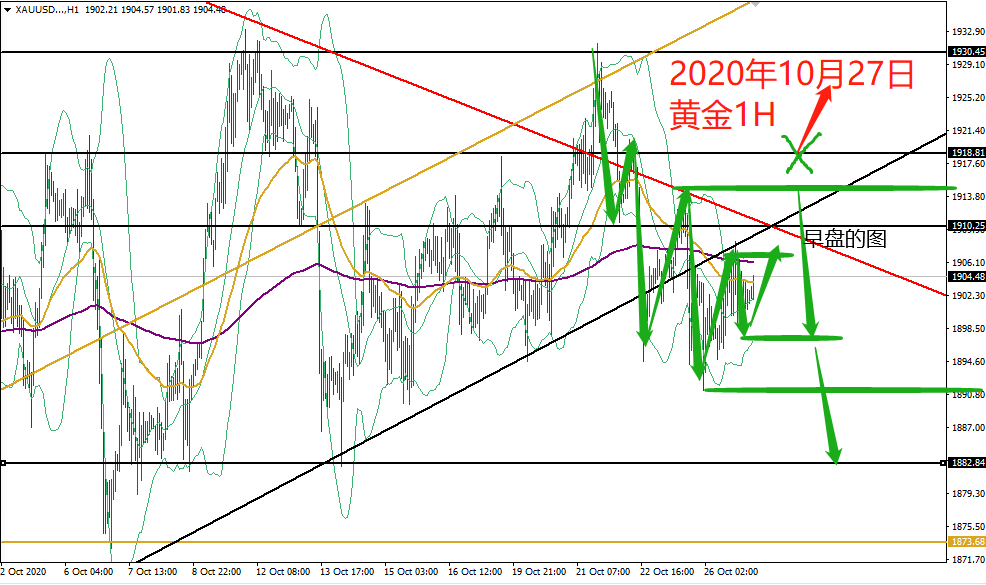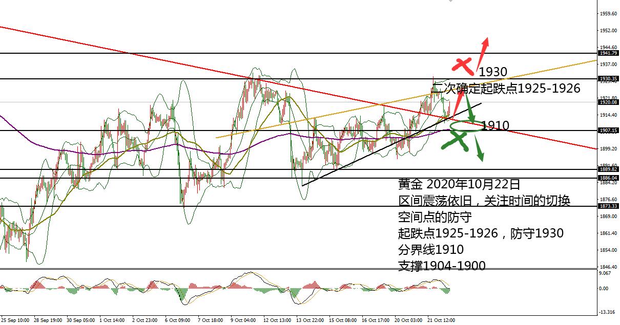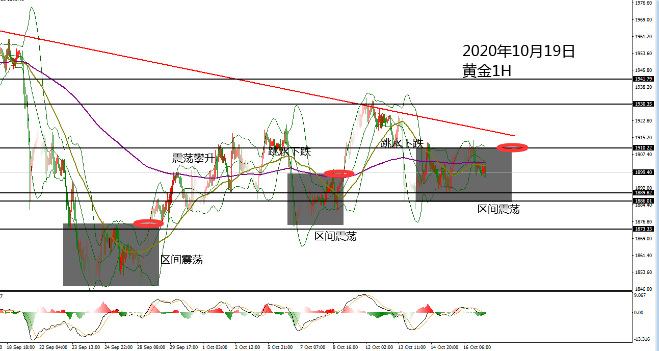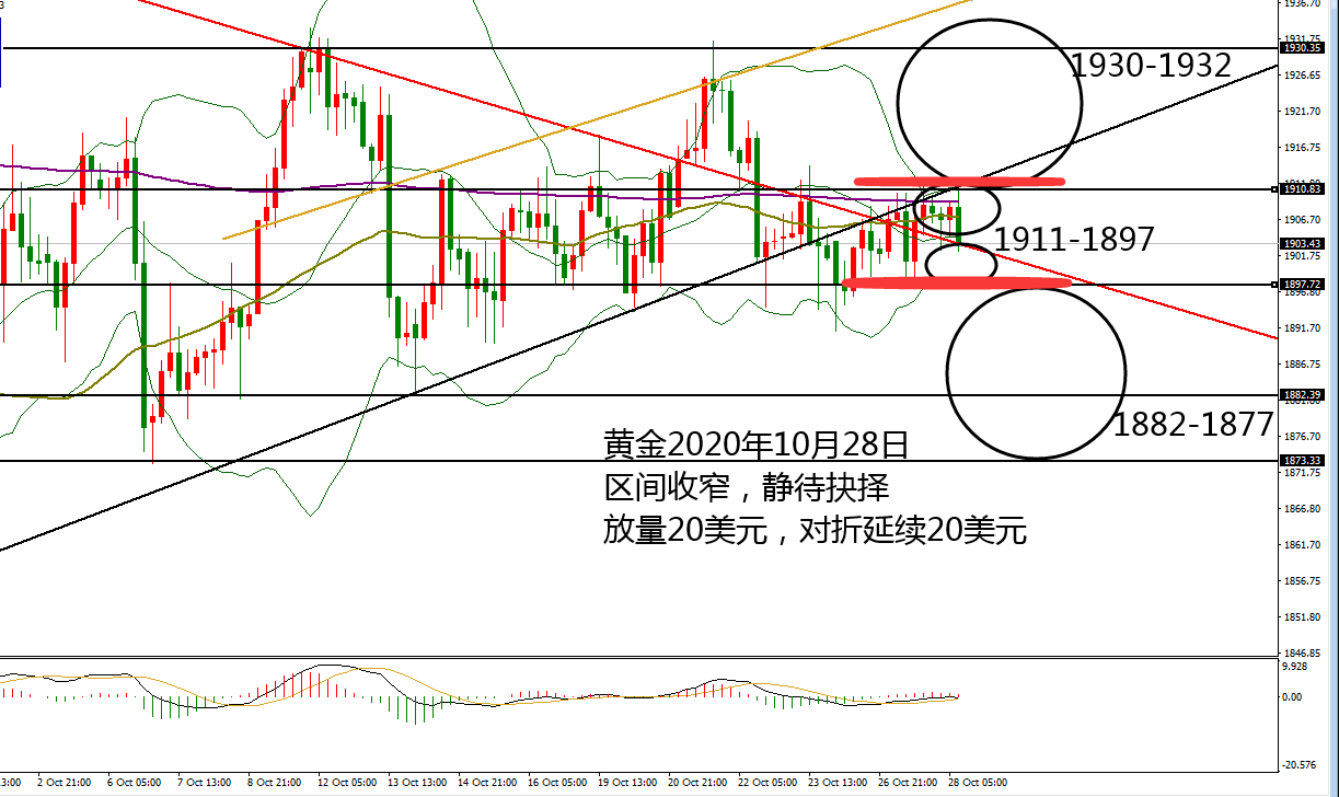 何小冰:黄金1911分界高空又盈,形态再收窄 10.27 黄金本周开局又是兜兜转转又一圈 ,没有直接形成放量开口的走势,反而是继续围绕区间震荡运行,市场在静待新一轮的行情开始,可能是美国大选,也可能是疫情推动,还有可能是A股刺激。 草木皆兵, 不单单是市场产品变得敏感,连投资者也开始自觉紧张,可能这就是2020年的魔力,一切都会来得很突然,一切也会离去得很突然。 黄金整一个10月不是在震荡,就是走在震荡的路上,不延续是最大的特色 ,并伴随着三个时间段行情进行切换,不同时间段,各具特色。 亚盘延续前一日凌晨的走势;欧盘重新选择,欧盘的节奏延续到美盘22点前;美盘22-23点行情再出现变数,以起