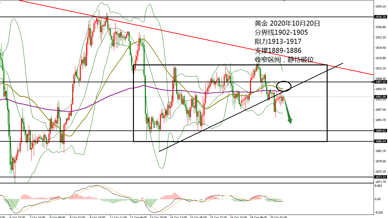 何小冰:周二黄金又会是大跌?财政刺激方案说了算10.20 涨也美国财政刺激方案,跌也美国财政刺激方案 ,因为这个消息的谈判一波三折,市场的整体走势也是较为波折,在昨日周一美国众议长给白宫下“最后通牒”要求48美元内达成刺激方案,这消息令黄金曾一度小幅走高攀升至1918区域。然而对于美元和美股并未有起到推升的作用,反而是继续震荡走低。美盘过后,鉴于对美国大选前达成协议不抱有希望,悲观情绪占位,黄金冲高回落继续徘徊1900关口。 而到了今日周二, 又是这个周二,在前一周周二美国总统出院后第一件事情就是宣布不会达成刺激方案,黄金跳水 ,随后众议院服软表示可谈,黄金震荡走高; 到了上周周二,美国众议