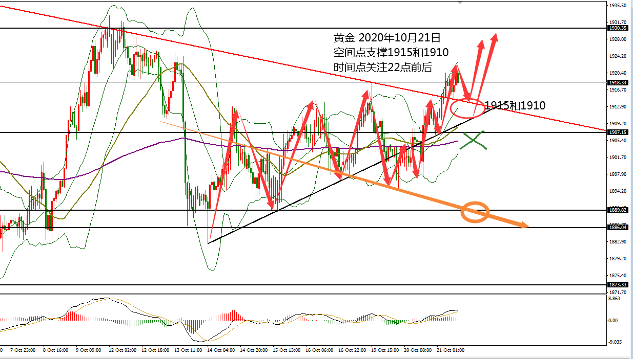 何小冰:黄金空间点1910,时间点22点定节奏 10.21 涨也财政刺激方案,跌也财政刺激方案, 在本周周二众议院议长佩洛西,财政刺激方案谈判取得不错的进展,将会在周三与努钦继续进行谈判,预计在11月初之前推出刺激方案。此消息提振市场信号,黄金和美股在消息公布之后上涨攀升,美元指数失守93关口。 今日早盘黄金延续攀升上探1920关口,午后回踩1915后在欧盘时段实现二次攀升上探走高,延续凌晨的走势,并在午后欧盘前得到延续攀升。 这是属于延续性的行情,符合强势不深调的节奏。 从节奏上震荡是确定的,区间是不定的 ,再伴随着两个时间点的规则, 最大的变化点是22点前后,22点-23点确定的行情将会