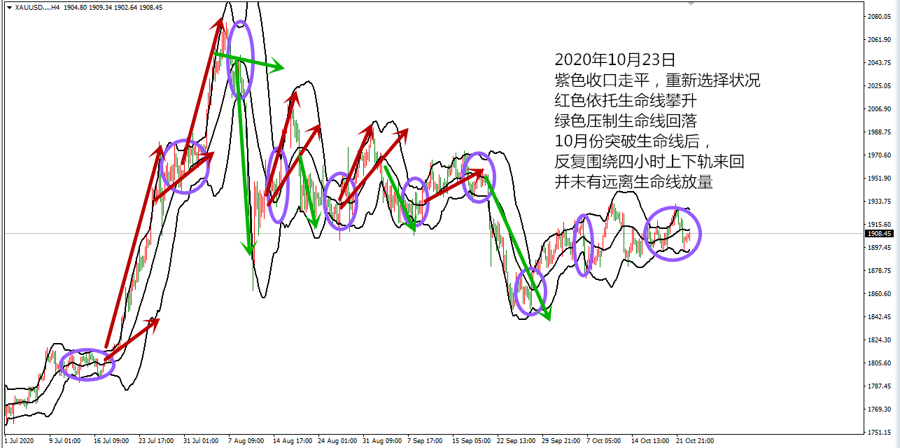 何小冰:市场单边抉择之前,你是三个队的哪一队? 每一次四小时布林带收窄走平,就意味着新的方向抉择即将开始,形态面临着开口--收口--走平-再开口循环 ,(这一点在此前的知识点关键词的技能讲解中有说明,不了解可以重新查阅),从过往的走势形态上均可以发现这样子的节奏,开口之后以生命线作为防守线持续进行放量,在此过程中 10日均线定义震荡性,5日均线定义趋势,极强极弱依托5日均线,震荡偏强偏弱依托10日均线,扫荡式依托生命线,再以生命线做抉择。 本周我们重点反复提及的就是四小时布林带收口走平,意味着当新的开口到来之际,便是趋势开口放量,不过很可惜,在周三最佳的开口放量时机,黄金并未有延续形成开口放