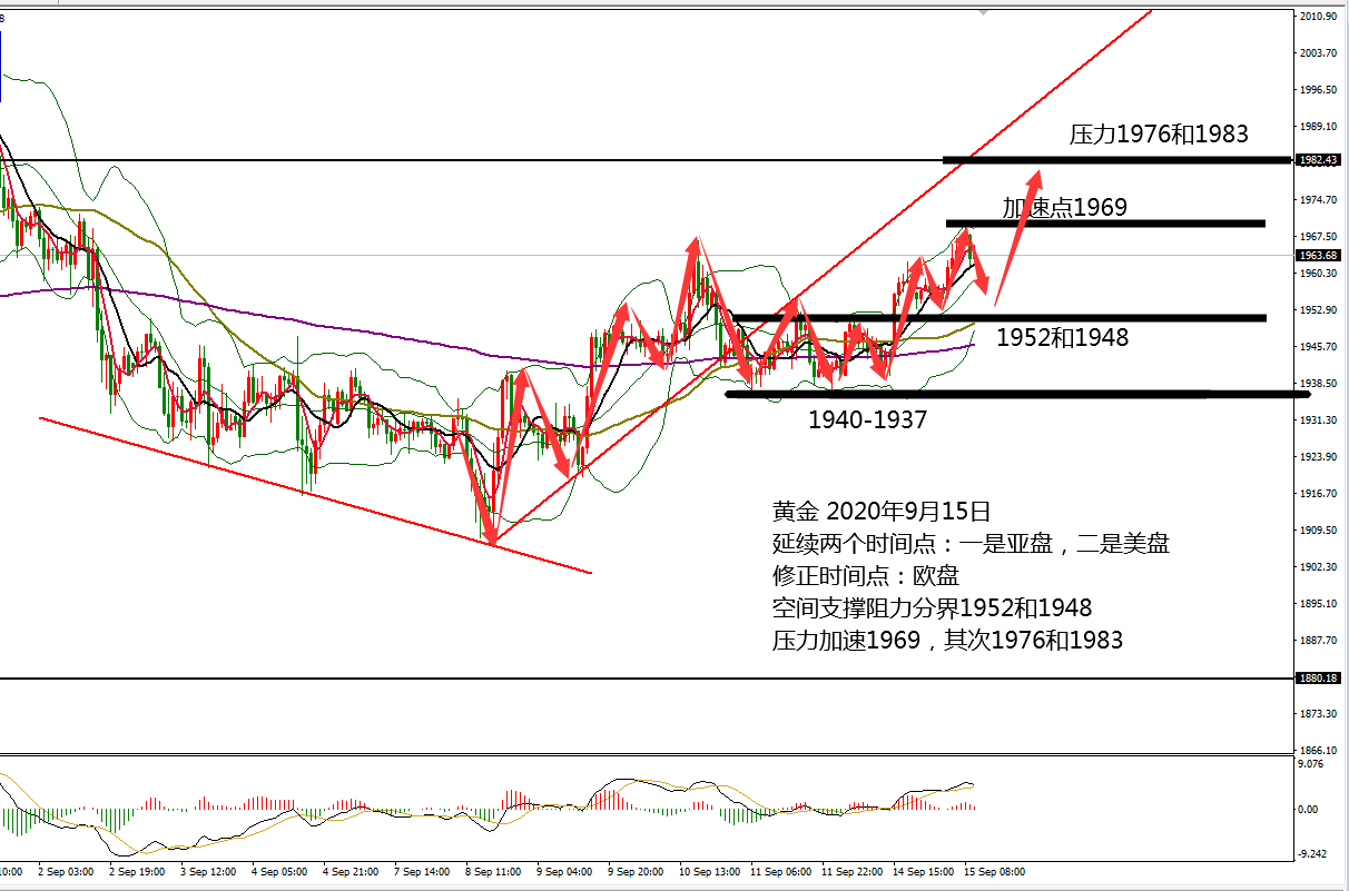 何小冰:黄金欧盘空美盘多,原油该跌不跌易变涨 09.15 黄金周一早盘支撑1937反弹走高上探1951.5,欧盘承压回踩1940,美盘再度确定1940支撑走高攀升,破日内高点扩大涨幅攀升至1962区域,尾盘高位横盘,回踩支撑1953后继续修正蓄势。 1937反复测试最终支撑有效走高,破1952.5基本没有回踩的动作,直接攀升走高,区间上移切换。 昨日的文章中再度提及周线5日均线, 作为3月份开始的攀升依托,虽然5月底6月初有所跌破,最终重新收复后开始一路攀升上探刷新新高,此处均线粘合成为支撑, 短线修正,长期仍是指明灯作用,支撑分界1940-1938。 日线布林带收窄区间1972-1915运